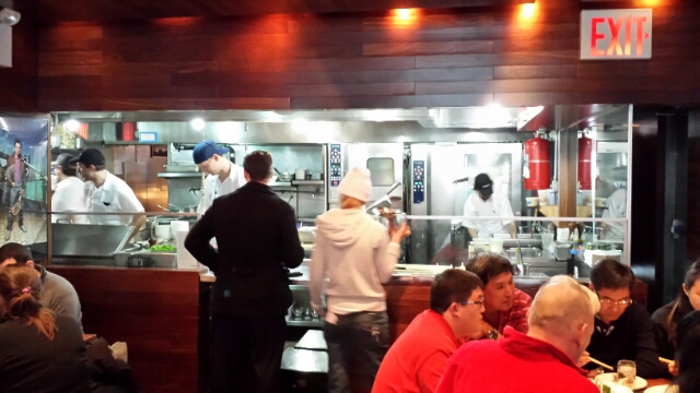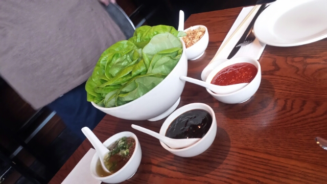 This particular dish is available at Momofuku Ssam Bar on 2nd Avenue at 13th Street. For $140 you get the duck (breast stuffed with duck sausage just under the skin and roasted) served atop a bed of jasmine rice; some chive pancakes and Bibb lettuce for wrapping; two seasonal sides (we chose the pickled veggies and kimchi, and the baby bok choy seasonal greens); and crispy shallots, cilantro, mint, Thai basil, watercress, hoisin sauce, Korean BBQ sauce and duck scallion sauce for toppings. They even bring out some duck broth made fresh at the end of the meal.