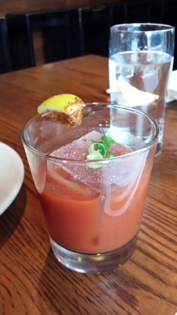First, my wife ordered a Bloody Mary. Here. it’s made with rye, sake, tomato, apple, ham, and togarashi. We thought it was a little on the small side for $11, and a little sweet, but it was meaty, spicy and otherwise good. Nice ice cube in there too.
