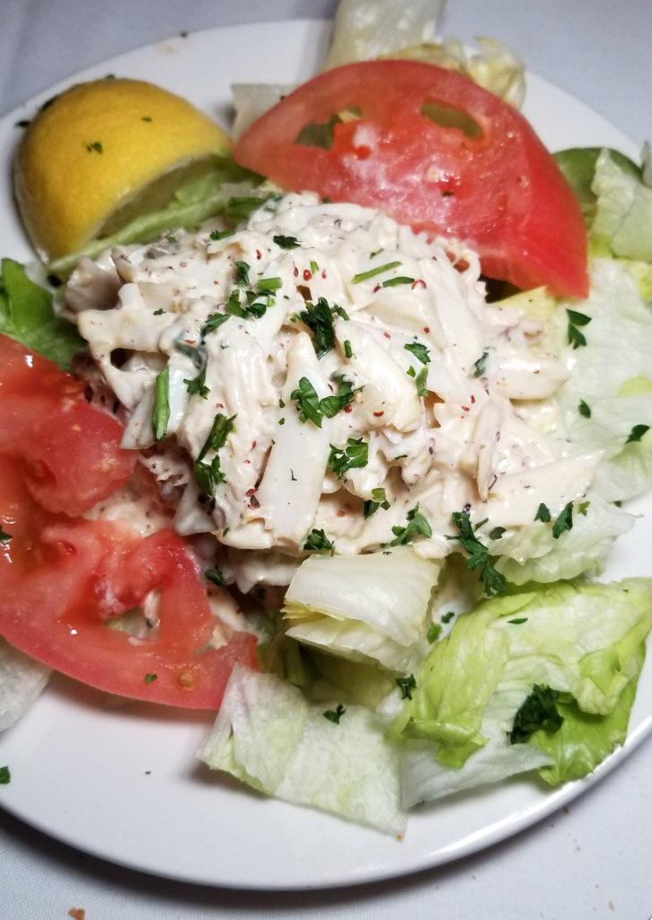 This crab appetizer didn’t look like much either, and from the menu description it sounded like it would have been more than dressed lump crab on top of iceberg lettuce and garnished with tomato. Nonetheless it was delicious.