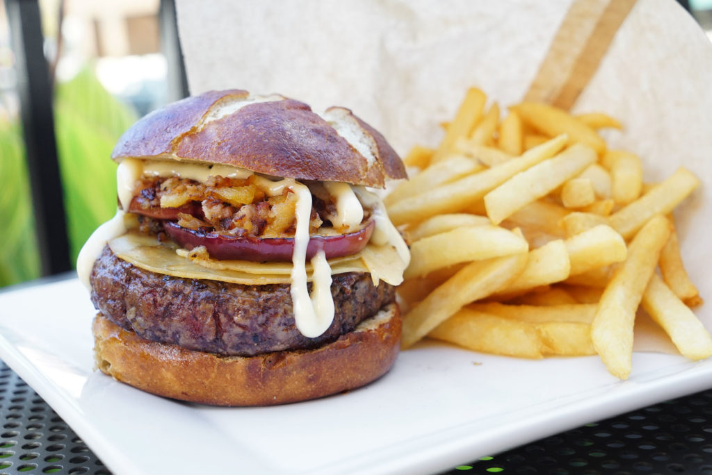 The Gastro Burger is a 9oz proprietary blend of always fresh, never frozen beef (ground daily in-house), and topped with smoked gouda, bacon onion jam, grilled apple, and roasted garlic aioli, all on a nice pretzel bun.