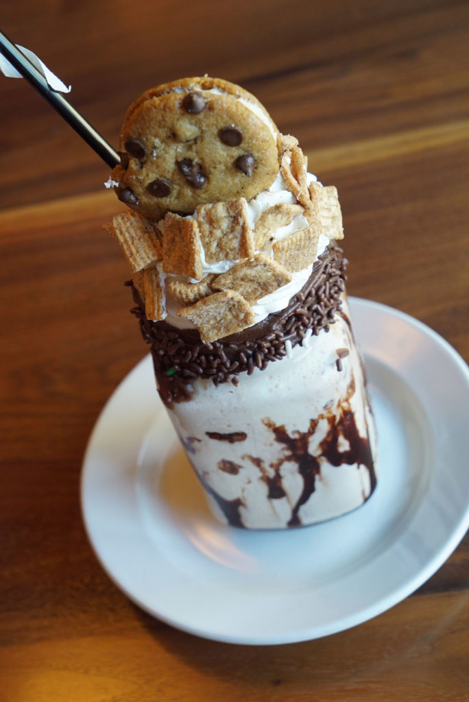 These are very popular with the kids these days. This Chocolate Chip Cookie Shake is made with vanilla ice cream, a chocolate swirl, and chocolate chips. Then it’s topped with a nice thick whipped cream and a mini ice cream cookie sandwich. I swapped my chocolate chips out for Cinnamon Toast Crunch cereal.