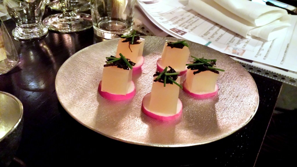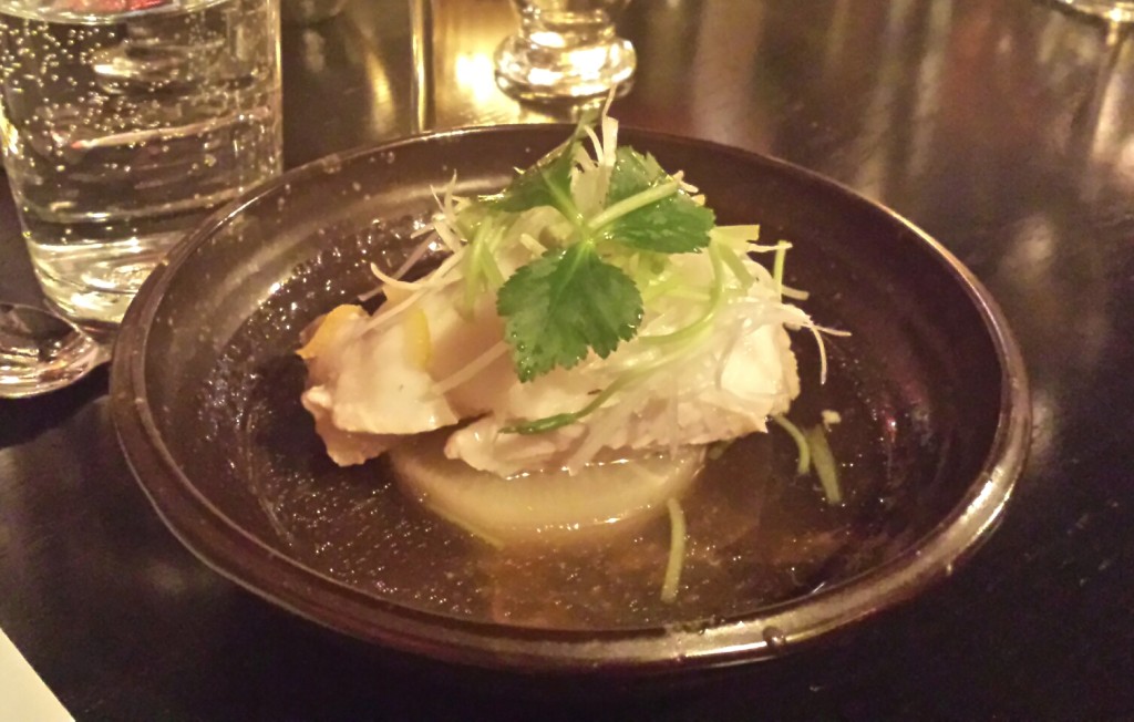First we had some sparkling sake with dashikarikori-kan (dashi jelly) with black truffle, sitting on a slice of radish and topped with scallion. The sake was like champagne, only better, because I hate champagne and I love sake. The dashi was earthy, had a really nice meaty texture, and it delivered a great crunch from the radish.