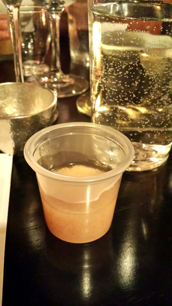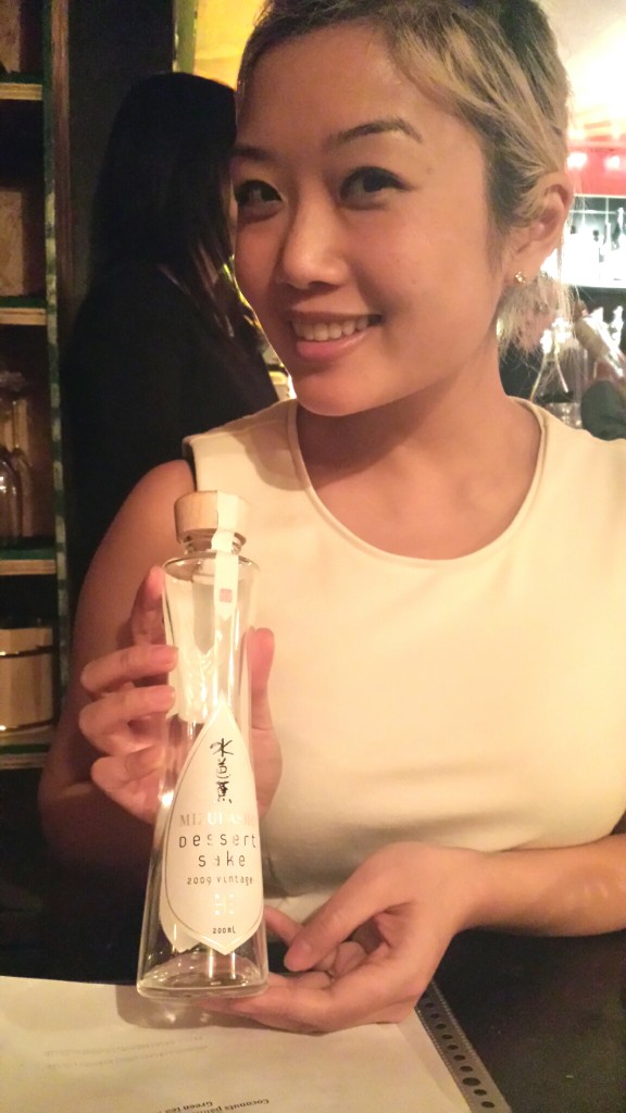 Our next course was beef rib eye with caramelized onion and grilled rice ball. NOW we’re talking! The onions were the real star here. They were minced and delicious. The dish came with a grilled shishito pepper too, which was nice and smokey. The steak was slightly over-cooked, but still very tasty and tender. I didn’t mind at all. The rice ball was crisped like it was grilled on the same surface as the beef, and it even retained a little of that meaty flavor from whatever it picked up off the grill. The sake pairing was a 2004 vintage, 10yr cold-aged sake that was limited quantity (only 40 bottles remain). It was clean and easy to drink, light, flavorful, and paired remarkably well with grilled meat even though it wasn’t as robust as a red wine.