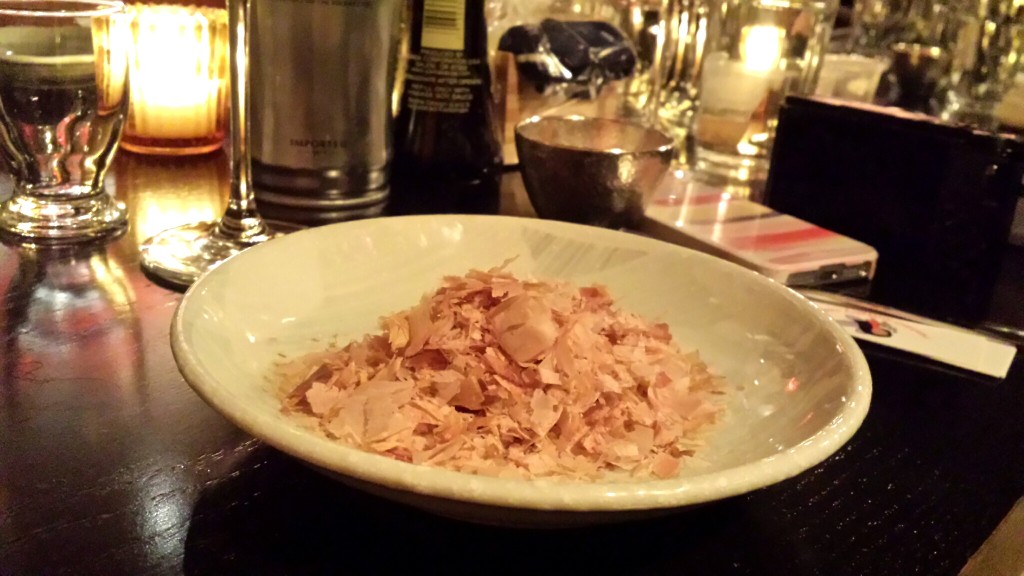 Then one of the dashi specialists explained to us the difference in miso soup that uses just miso + water versus miso + dashi, and he showed us the two main components of dashi (kombu kelp and katsuobushi/benito flakes). We were easily able to taste a vast world of difference between the two cups of miso. The miso + dashi was way more rich, earthier, and generally much more awesome.