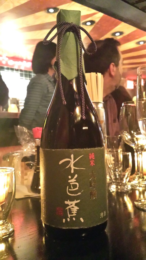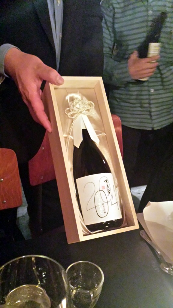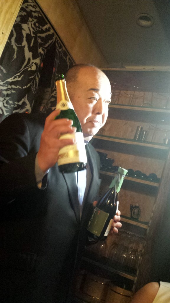 Chef Tadashi Ono, the former executive chef of Matsuri, presented his culinary creations at the Tabelog event. We enjoyed a special tasting menu of Dashi and Agar, along with Mizubasho sake pairings. As with any good meal, you start out with some booze. Our official booze man was Shoichi Nagai, of the Mizubasho brand. Here is a shot of him explaining the differences between some of the sake we tasted: