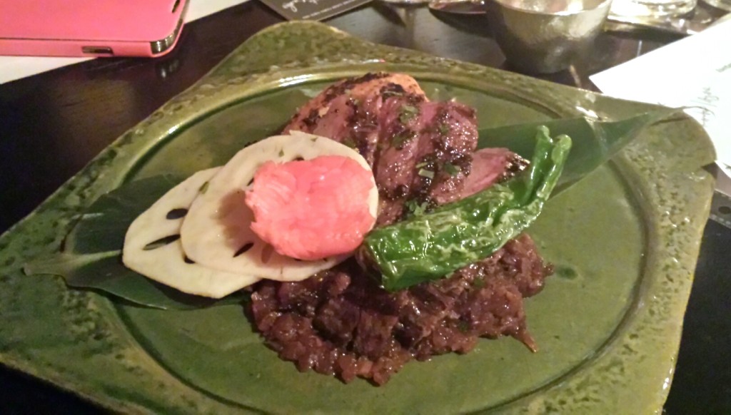 Next came the fish course: black cod with a sake and dashi-kanten gravy (dashi plus agar for thickening and flavor). It was paired with a cold-aged, 2-year sake that was crisp and complex. We drank it from two cups (one glass and one tin) and the type of cup you drink from actually alters the flavors. Tin cup is much better. As for the cod; the aroma was amazing, and the flavor was light but powerful. It was cooked perfectly.