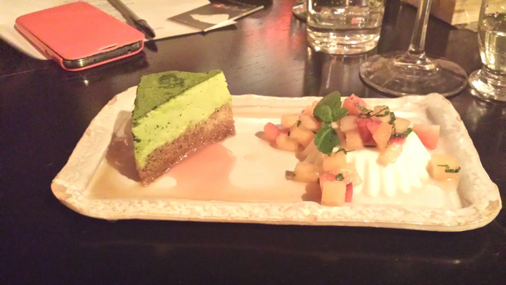 For dessert we had a sweet, 2009 dessert sake that was reminiscent of ice wine. They said it would pair nicely with everything from sweets to fois gras and even uni or salmon roe. I could see it for the uni, as the taste was somewhat aromatic and perfumed, as is uni. This was presented with a coconut panna cotta and green tea tiramisu. The tiramisu had great flavor, and the panna cotta was firm and packed a lot of punch for something that looked so light.