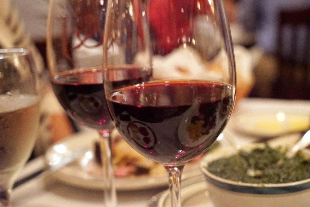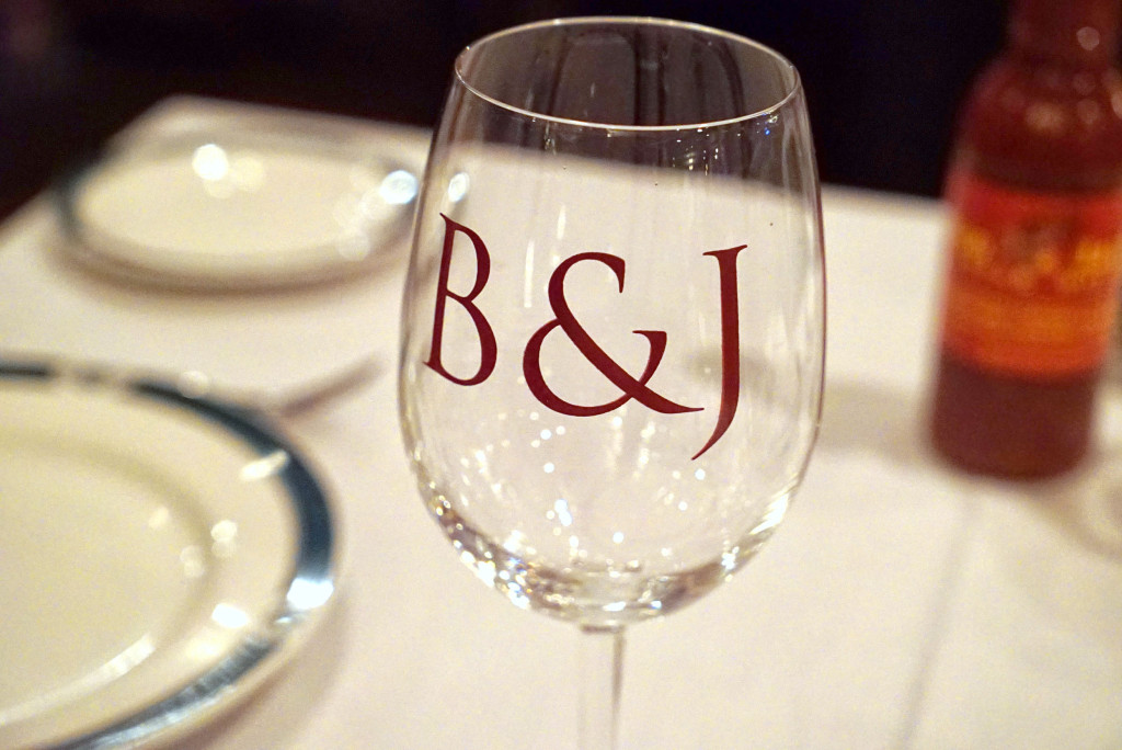 We also tried a nice cabernet with the steaks, served in their “B&J” wine glasses: