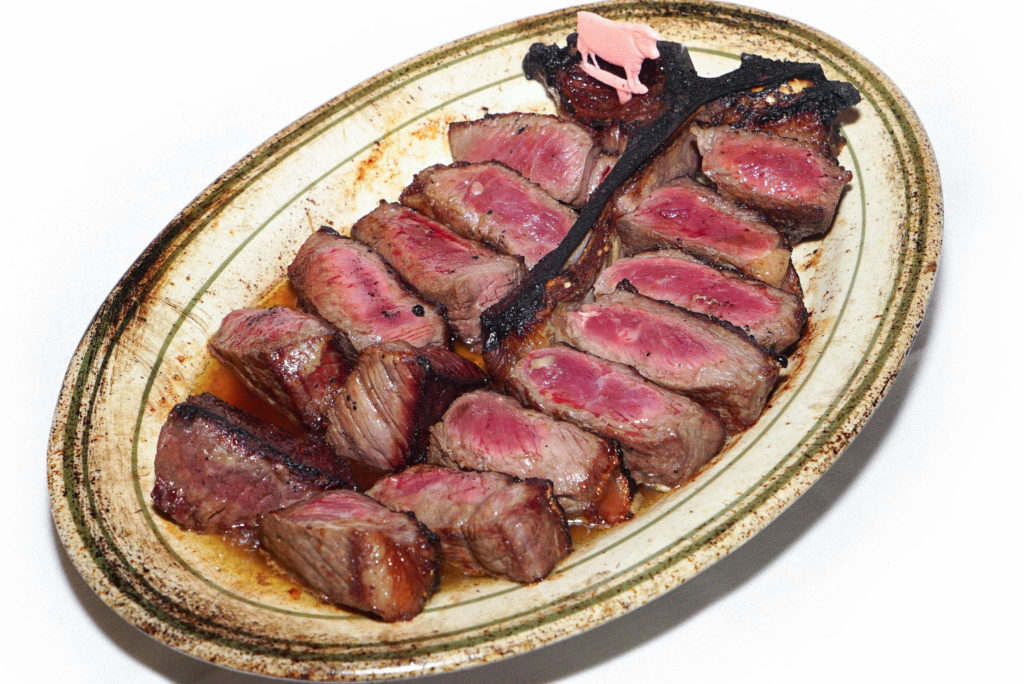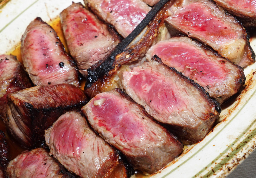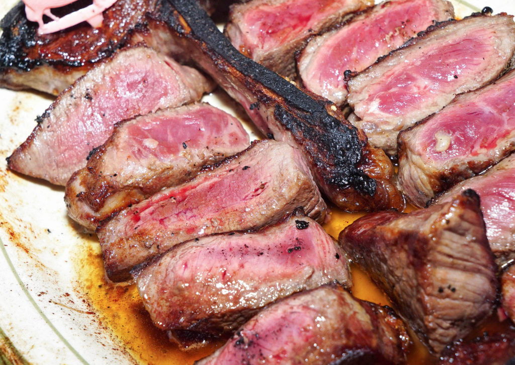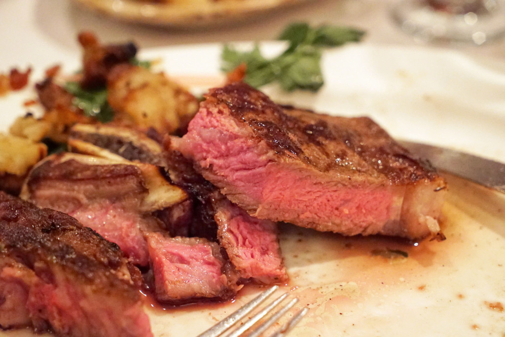 Okay so back to flavor… As for the rib eye, the cap was delicious. The fat was entirely edible and tasted like meat bubblegum with a little charred crisp to it. The cut was a partial bone-in, meaning there was a small shard on one end, and a bit of bone across on the other side as well, but not connected completely.