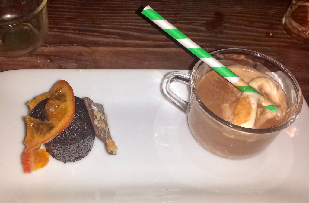 Desert was somewhat of a letdown, although it did have its moments. First was a chocolate ice cream soda with devil’s food and candied orange. I liked the soda/ice cream portion, but didn’t like the devil’s food and orange bit. When you live with The Cake Dealer, you get spoiled as far as baked items go.