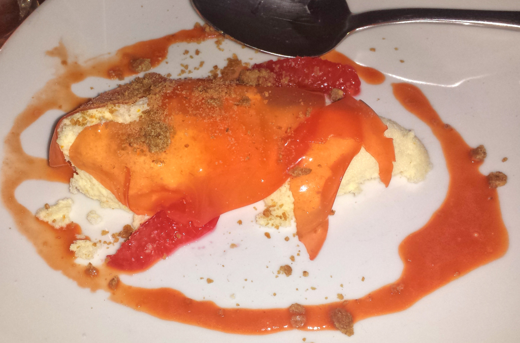The other dessert, which was intended to be creative and skillfully prepared, was pretty much a disaster as far as everyone at our table was concerned. The cake portion beneath would have been fine on its own, or with a more normal, natural topping. The blood orange item was a chemically induced film that had an awkward texture – like the skin that forms on top of jello. Ugh. It was sort of a shitty way to end the meal.