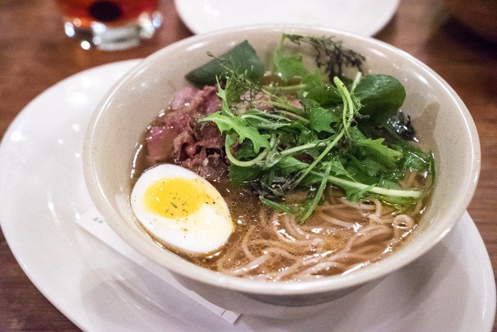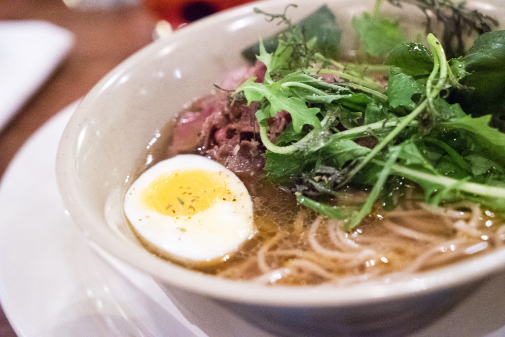 Okay, so Maialino’s “Roman Ramen” uses farro noodles in a pork broth, with a thick slice of porchetta, black pepper oil, some shaved greens, and, of course, a soft-boiled egg to achieve the most perfect ramen fusion dish one could possibly imagine. Everything just fits well. The noodles reminded me a little bit of the rye style noodles from Ivan Ramen Slurp Shop. They had a nice bite and texture to them. The pork maybe could have been braised better, as there was a slight bit of chew to it, but I didn’t mind so much because the flavor was really outstanding. It was distinctly Italian in flavor but Japanese in delivery. Another ingredient suggestion would be some kind of fungus. Like the Japanese, Italians are quite fond of mushrooms (remember – they are all over Super Mario Bros.): So perhaps some thin sliced raw baby bellas or julienne cut cooked portobellos would fit nicely in this bowl. At only $10 it’s a good deal too. The black pepper oil really sets this bowl apart from the others. I need to locate this stuff ASAP because I can no longer live without it.