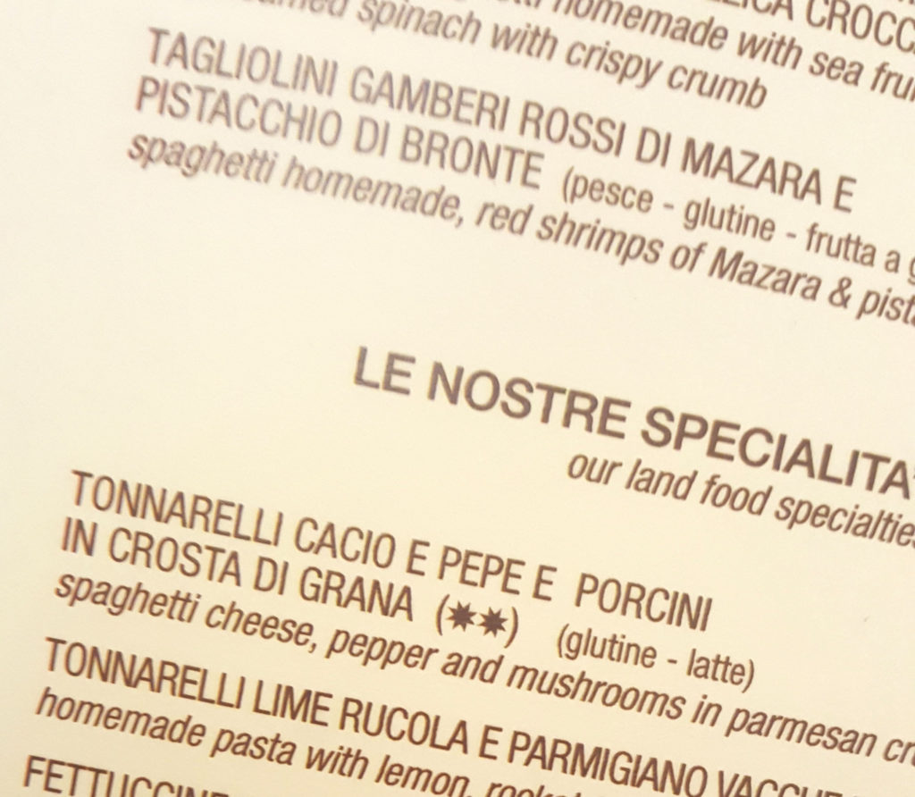 We tried two pasta dishes; cacio e pepe, served in a bowl made of crisped cheese, and a chitarra pasta with shrimp and a ground pistachio pesto.