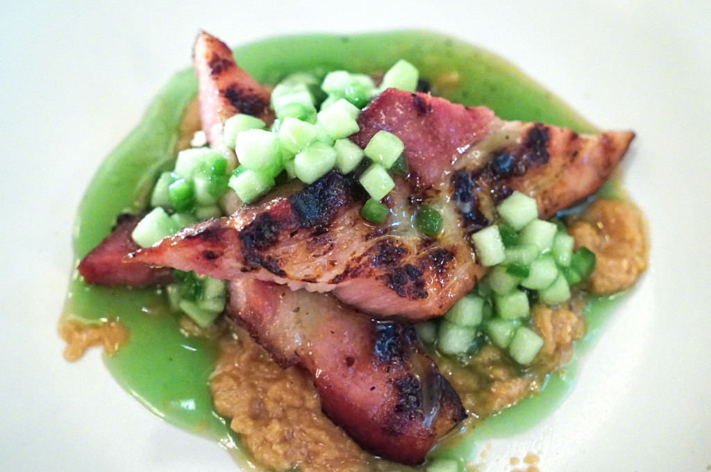 Another great entry in the classic style category, this “Canadian” slab bacon is legit. Usually when I hear the words “Canadian Bacon” I think of circular shaped stuff that tastes more like ham than bacon. Not here. The soft, buttery fat banding alternates perfectly with the lean meat on these grilled slabs. They are also nearly an inch thick, so you really get great satisfaction from this dish.