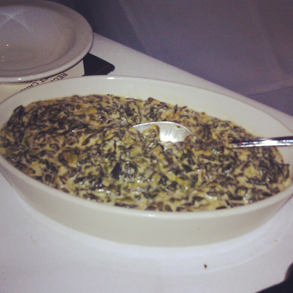The sizes are good here, and everything seems to be prime caliber. The ribeye was 24oz on the bone, and 18oz off. The strip was 16oz. Filets are 9oz or 14oz, and as I mentioned above they don’t skimp out when you do the surf & turf deals. The creamed spinach was tremendous (see pic below) – unfortunately I only had two bites of it. The servers forgot to bring out the doggie bag to take that home (couldn’t finish). Oops. The plating was basic, and it’s really simple to achieve: cook meat, place meat on plate, serve. I’m cool with that. But that little bit of parsley?!?? Make it cilantro and I’ll eat it. Parsley is as useless as tits on a bull. I’m a fucking man for God’s sake. I don’t need a sprig of parsley on my plate or a tweel of balsamic infused chocolate sticking out of my potatoes for that matter (didn’t happen here, but it DOES happen). Dear chefs who do that: Go fuck yourselves. Sincerely, Johnny Prime. PS: What’s the difference between parsley and pussy? You don’t eat parsley…