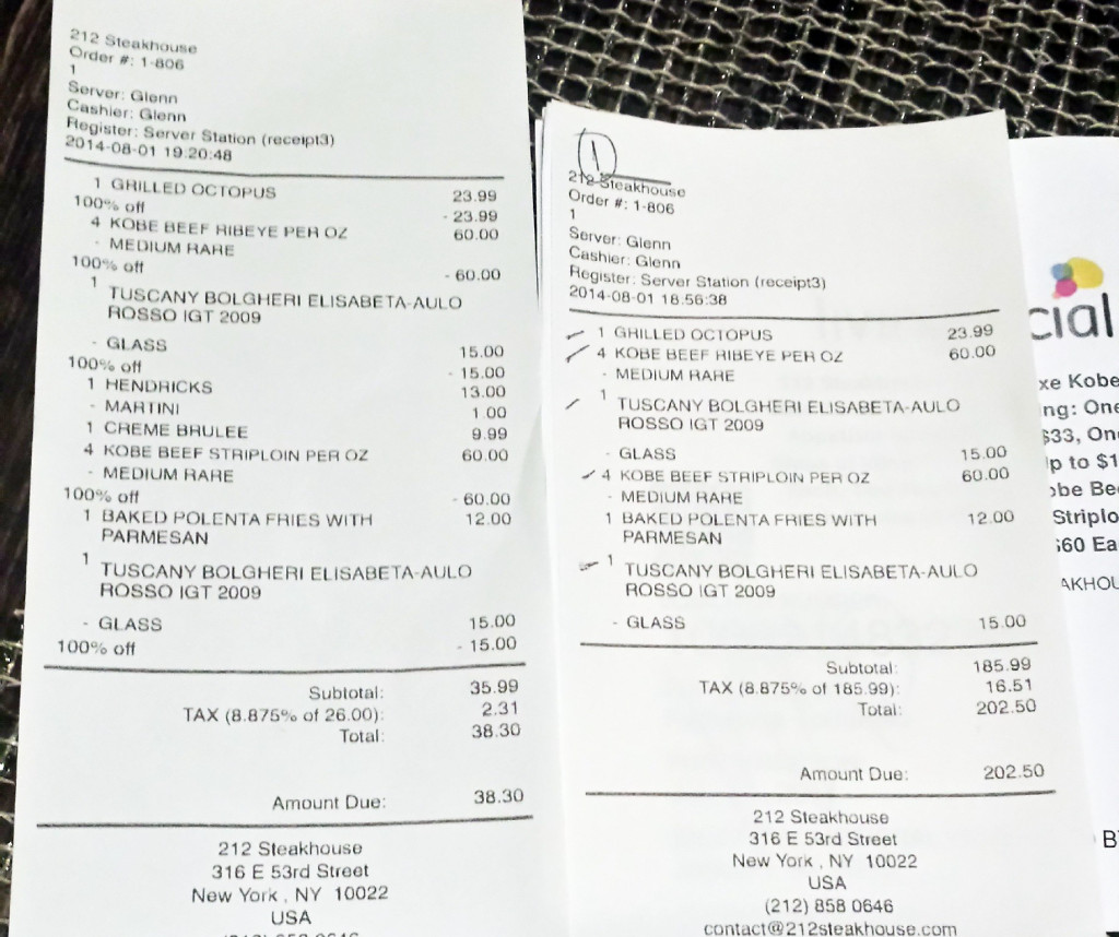 I have to give a 10 here because we felt like we got such an amazing deal. If you’re going to blow your budget on a steak meal then this might be the right place to do it. It’s not a traditional steakhouse atmosphere, so know that going into the transaction. What you are coming here for is once-in-a-lifetime steak. And since they are still running mega-discounts on their menu right now, both as a walk in and via the Living Social deal, I suggest you high-tail your asses over there ASAP to take advantage of these prices. They have every justification to charge double. Believe me; it’s worth every bite. Not only that but they seemingly knocked some items off our bill as well, like the desserts. That said, the minimum 4oz order will run you $60, and that’s at the super-duper-blowout-sale price. The normal price is $45/oz, muthafucka! Let’s put it in yet another way: Had we paid full price for this meal, it would have cost us about $460. Even the discounted price, as you see below, was still over $200. We paid just about $150 I think, with tax and tip included.