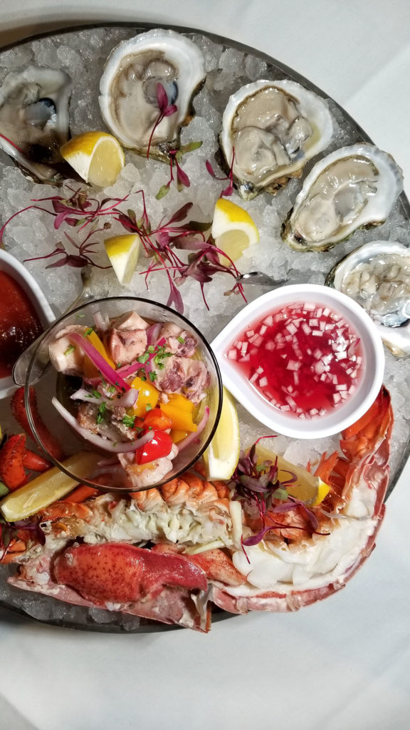The seafood platter for two contains three items: warm octopus salad, a half lobster cocktail, and eight oysters. Not too bad for $55.