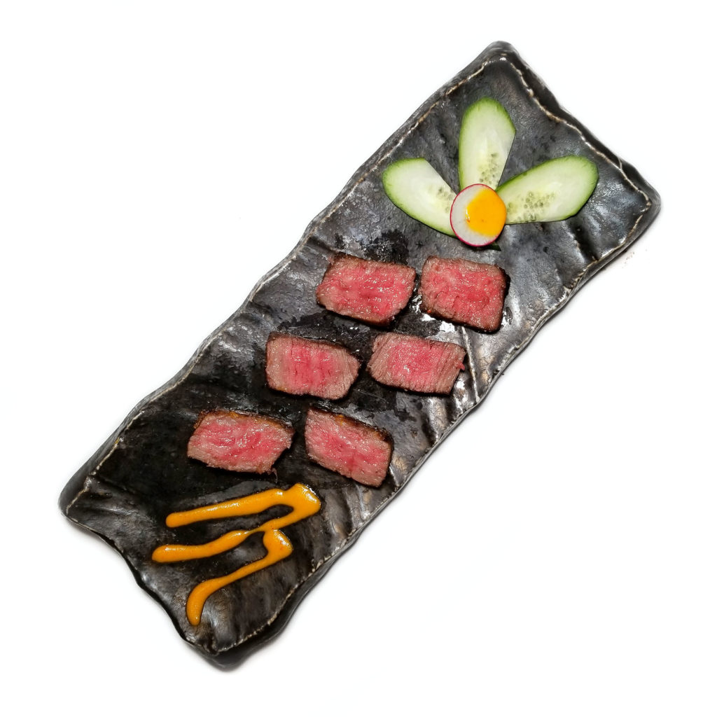 Portions are pretty much DIY, so if you’re willing to spend to get more, then you’ll be a happy camper. The pre-set size cuts are 8oz, 10oz or 12oz, which is pretty standard for the high quality meat game, and they’re typically boneless as well. Otherwise you’re looking at a minimum of 4oz on the Japanese meats. And before you freak out about the bone being taken out, ask yourself if you’ve ever tried meat like this before. The bone is not needed when there is so much flavor in the beef and you can literally melt the marbling with the warmth in your finger! The plating for the beef is really nice, on slate plates. But don’t run your knife across the plate or you might get the chills. EEEEEEK!