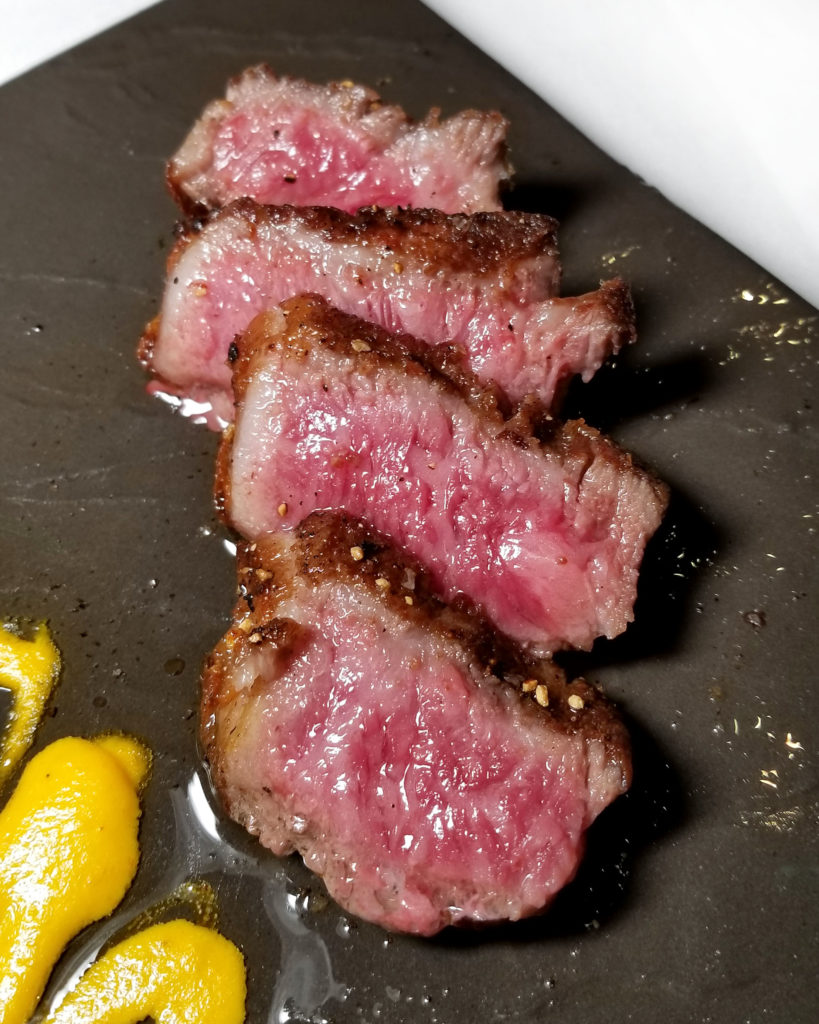 Easily some of the very best steak I’ve ever had and will ever have in my life. You can taste the flavor of the meat more in the strip loin, and you can taste the flavor of the fat more in the rib eye. I think both my wife and I preferred the strip. Typically I will pick the rib eye because I enjoy the fat flavor more, and there tends to be better marbling in the rib eye. But with meat like kobe, there is plenty of good, melty, intra-muscular fat and marbling in the strip cuts as well. Listen, assholes… The point is this: you can’t go wrong either way. Just look at this shit! Strip 10/10, rib eye 9/10.