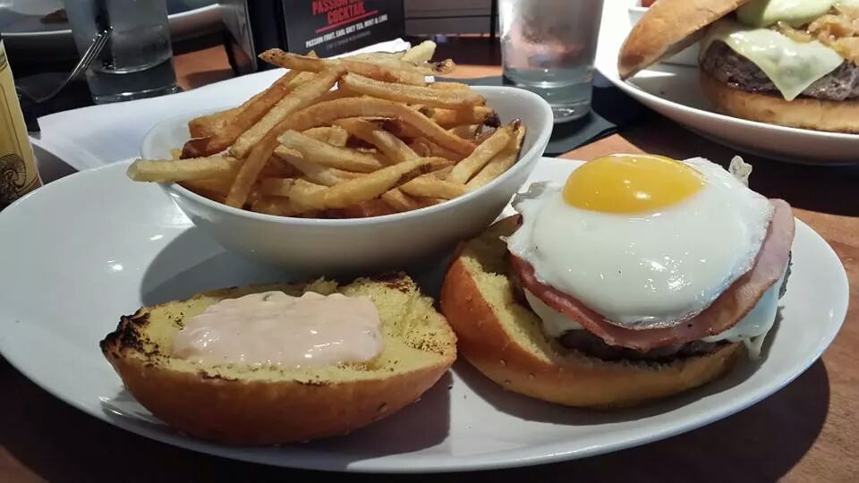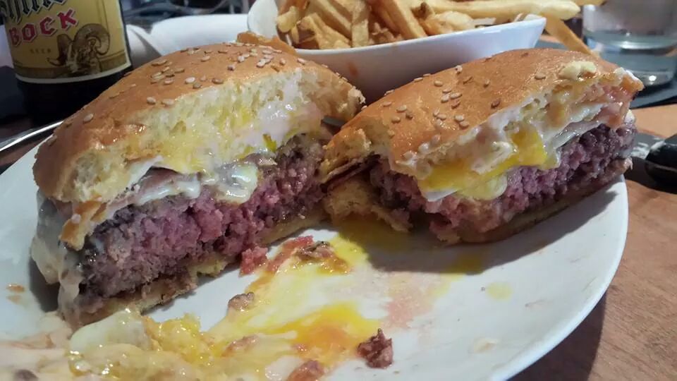 I had a breakfast burger of some sort, which came with ham and egg on top of that bitch. It was really good, perfectly cooked too, as you can tell from the cut shot.
