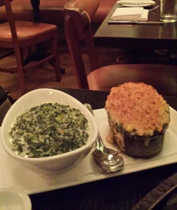 My wife and I came here with a deal from Gilt: $76 for a shared app, a porterhouse for two, two sides, and a dessert. The porterhouse was really good. It was a shade above medium rare, but I do recognize how difficult it is to cook a porterhouse properly: two different meats that should really have different cooking methods and times. The strip side was cooked better than the filet, but both were great. The meat was well seasoned, juicy (except for the edges that went a little over), and well rested before serving. I was shocked at this, since most times porterhouses come out sizzling like the obnoxious fajitas at fucking Fridays, which, in my opinion, completely destroys the steak. Bravo Abe (or Arthur) for knowing not to participate in that most fucked up of steakhouse cliches. The steak sauce was nice but better for something like chicken.