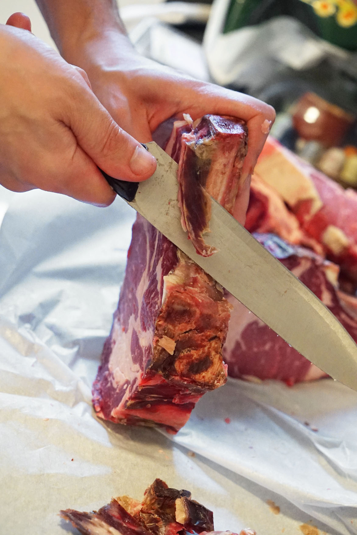Dry-aging processes tend to cause the meat to desiccate to the point where you can lose almost a third of the original weight. So if you’re starting with many pounds of meat, typically untrimmed of any fat and still having the bones in, then it doesn’t hurt so much when your beef loses some weight and eventually gets trimmed. The reason I say “high fat content” is because fat equals flavor, and dry-aging increases and concentrates flavor. During the process, that fat content also becomes very tender, and acts like butter when it gets rendered out during cooking.