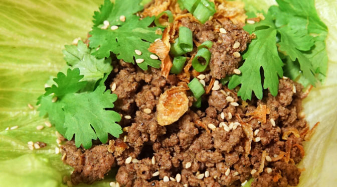 Scoop out portions of the beef into Bibb or Iceberg lettuce. Drizzle on some toasted sesame oil, sprinkle on some sesame seeds, and top with fresh cilantro, sliced fresh scallions and crispy fried shallots or onions. Then shove it into your mouth and eat it.