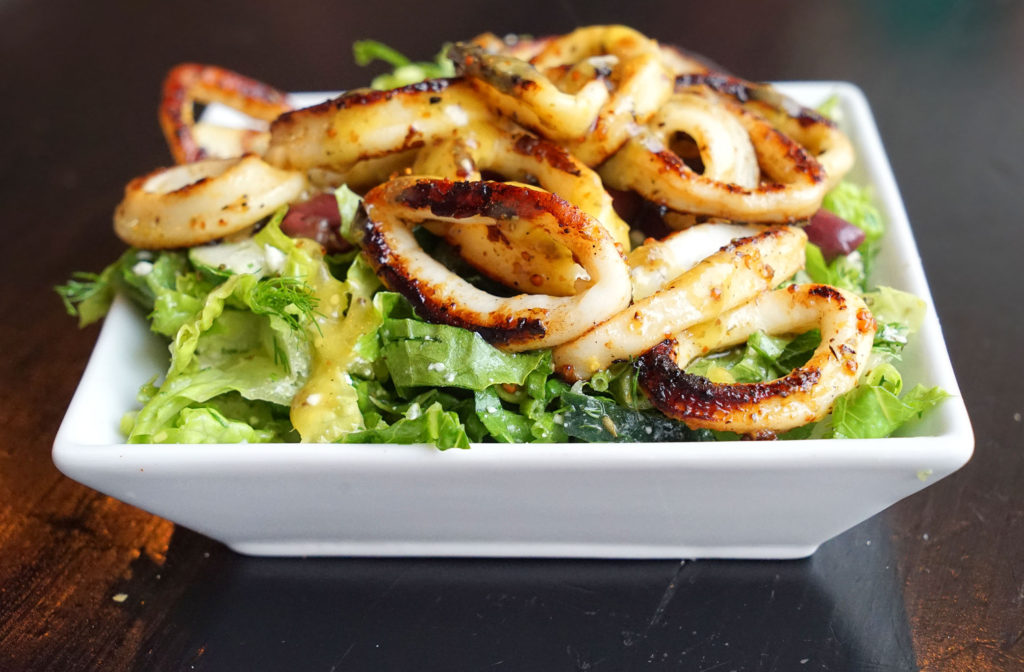 • Kalamaraki (grilled squid in lemon oil, served over greens): Perfectly cooked squid with great texture and grill flavors. The kalamata olives in the salad really make this dish pop.