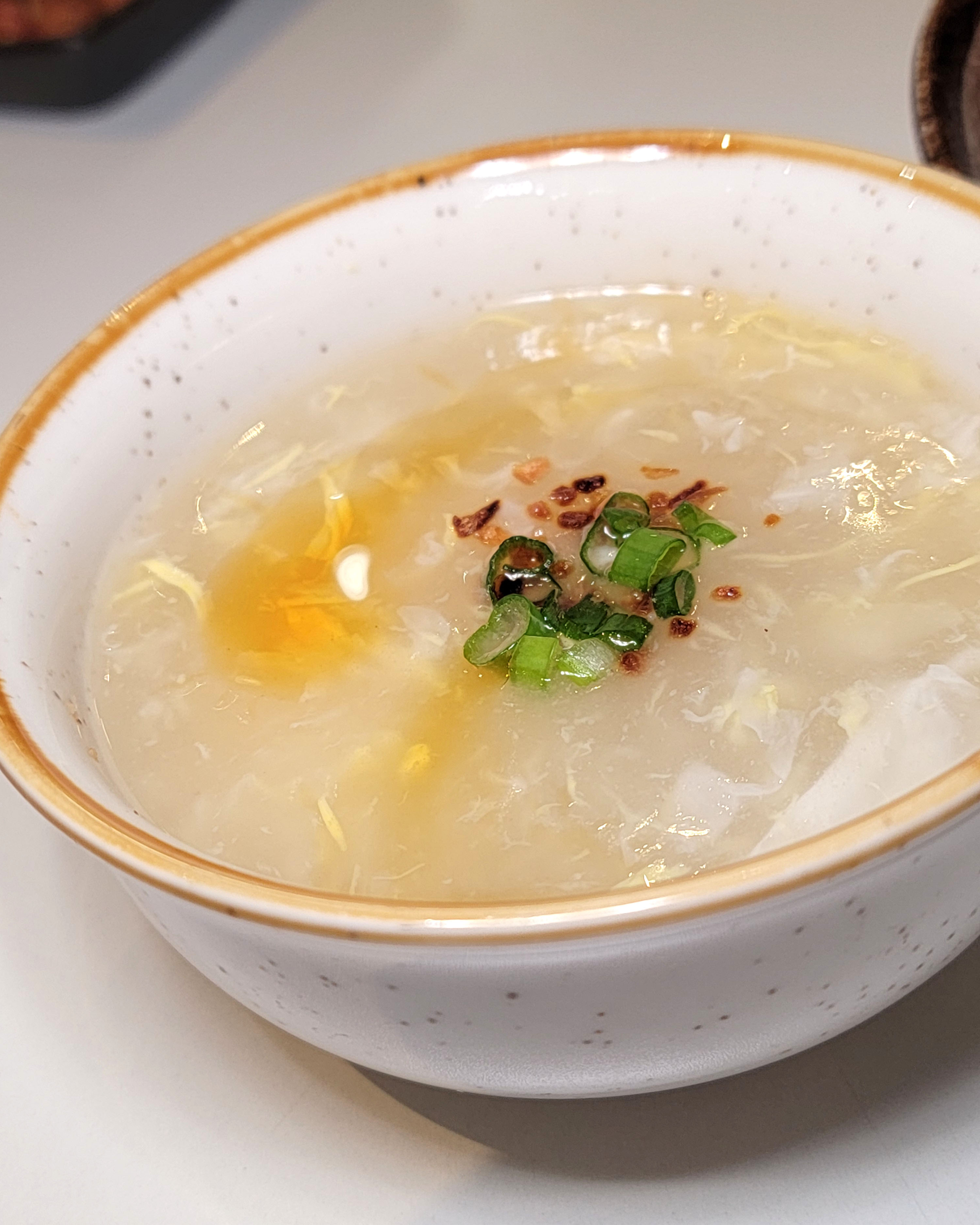 First, the complimentary egg drop soup was fantastic. I could eat a gallo.
