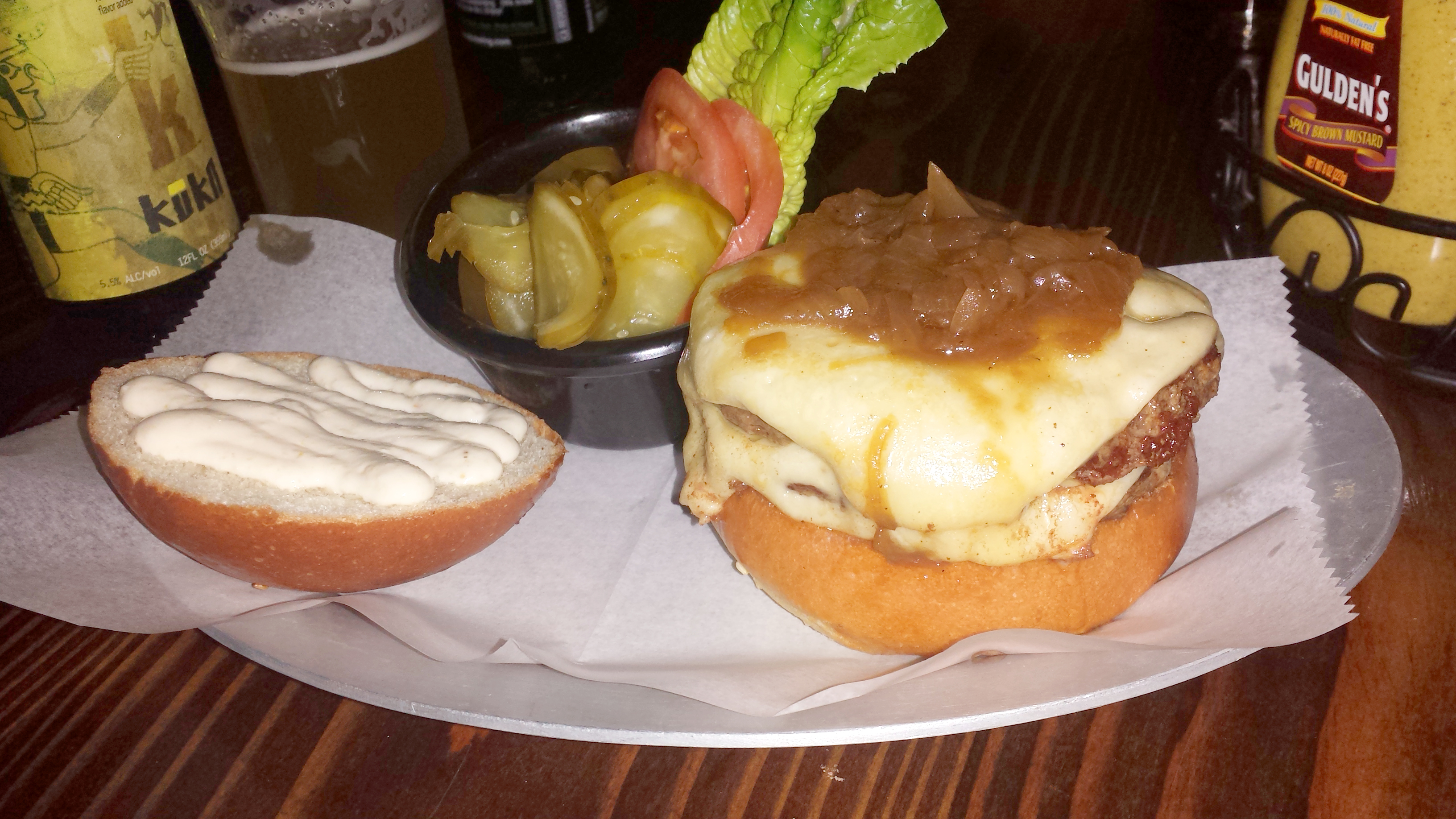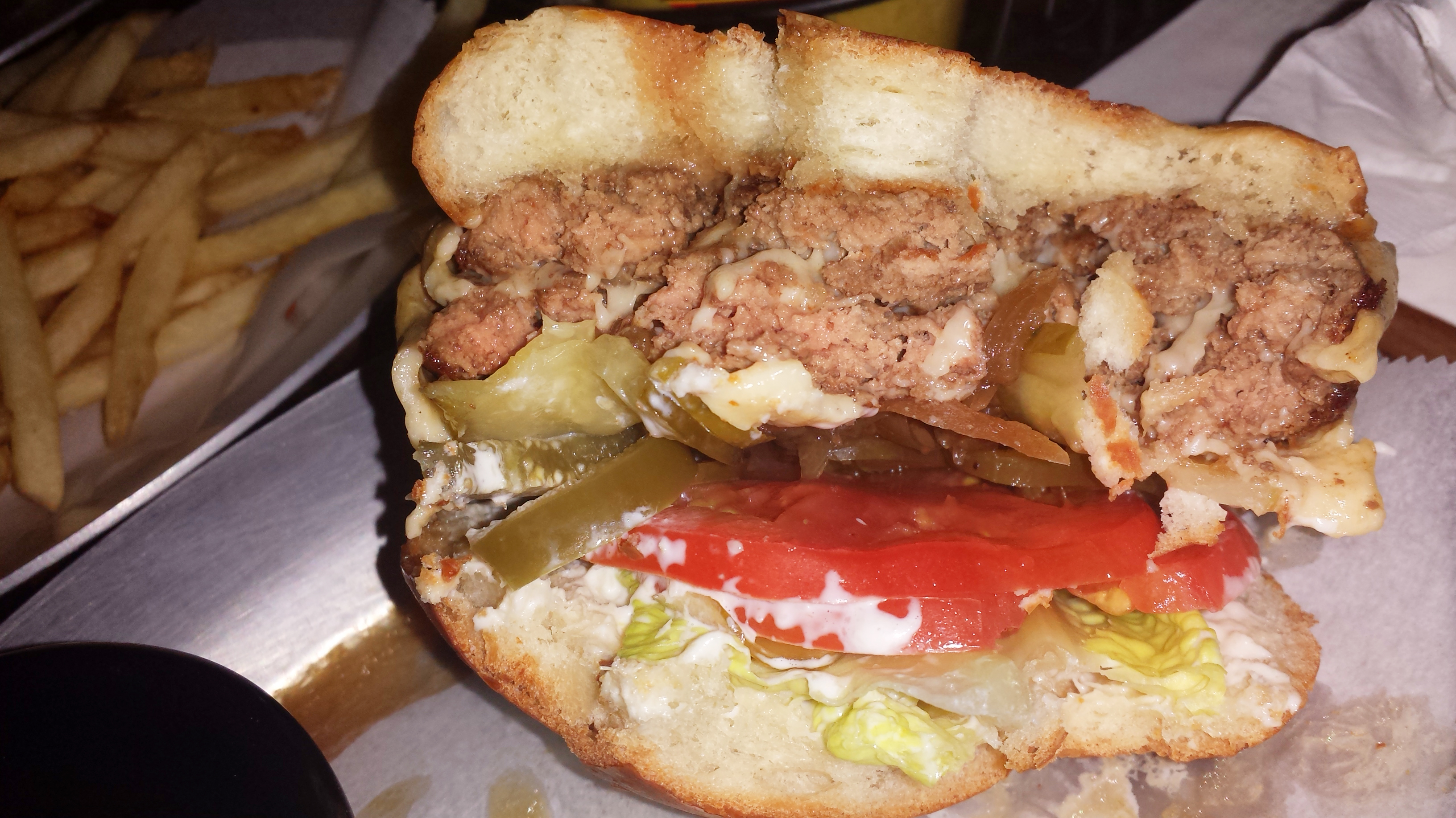 The bread was a little bit lacking. The top of the bun was a little too hard, and the bun itself seemed to crumble a bit as I got further along into the gorging. The meat itself was fine – good quality shit, and good cheese ratio as well. All in all it was a decent meal, despite having to wait a fuck-ass of a long time for a seat because it was more crowded than a whore house near a military base.