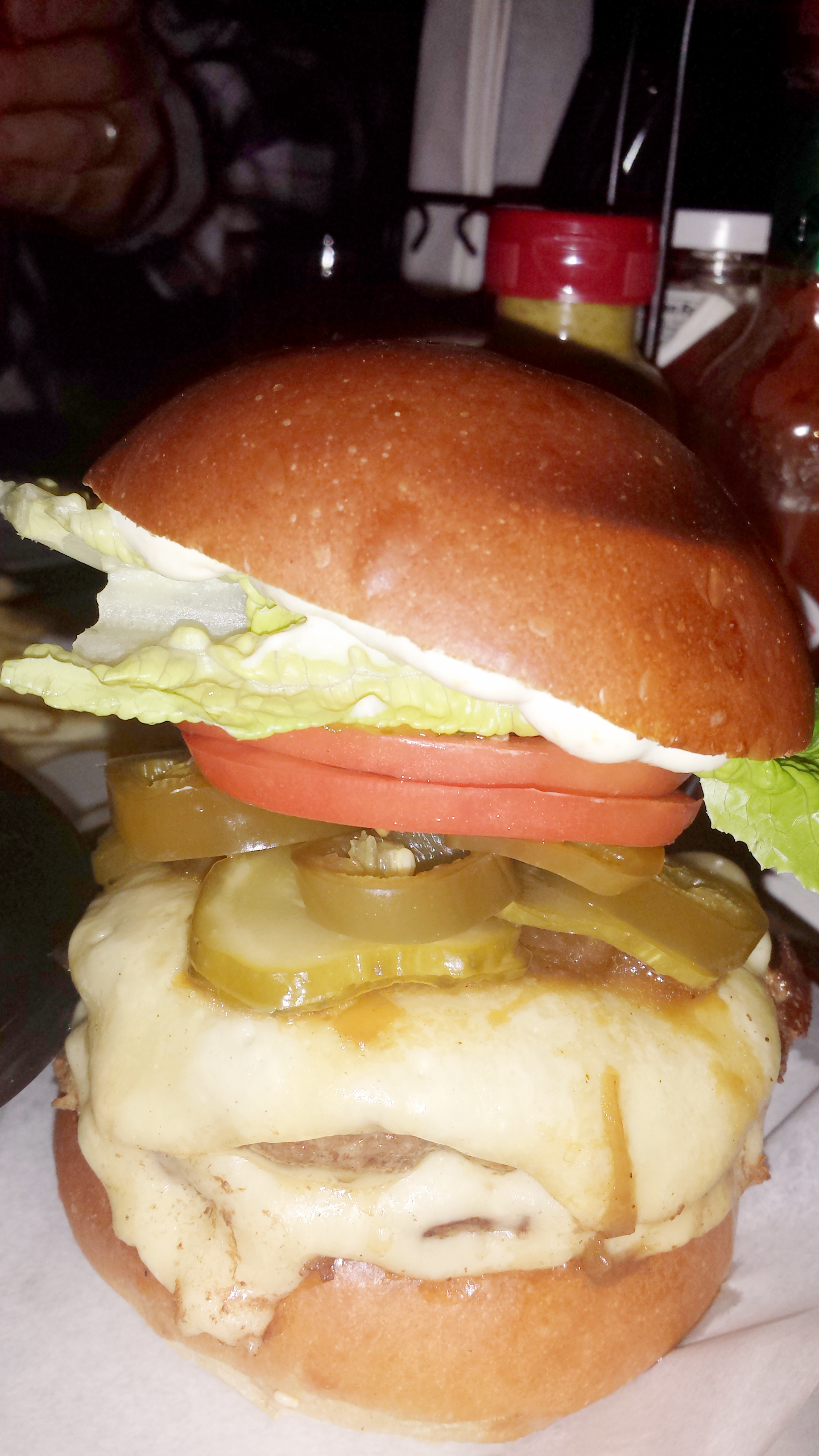 On to the beef. I had the black iron burger, the house signature burger. It has two 4oz burgers, two thick slices of horseradish cheddar, horseradish sauce, and caramelized onions. Solid. I added lettuce, tomato, pickle and jalapeño on top of that little slut to make it taste like warm molasses titty milk. I don’t know what that even means – I just had to publish it.