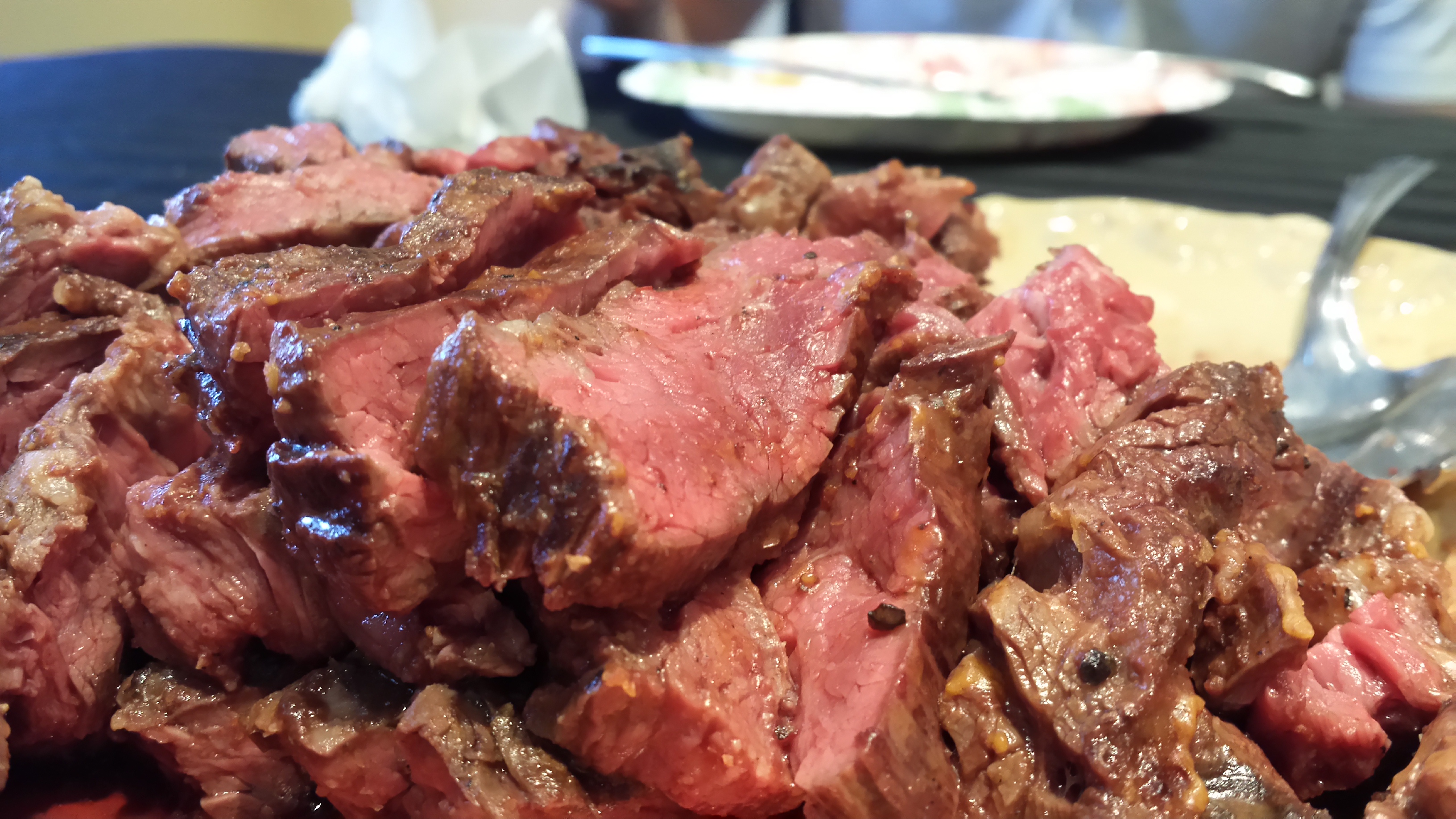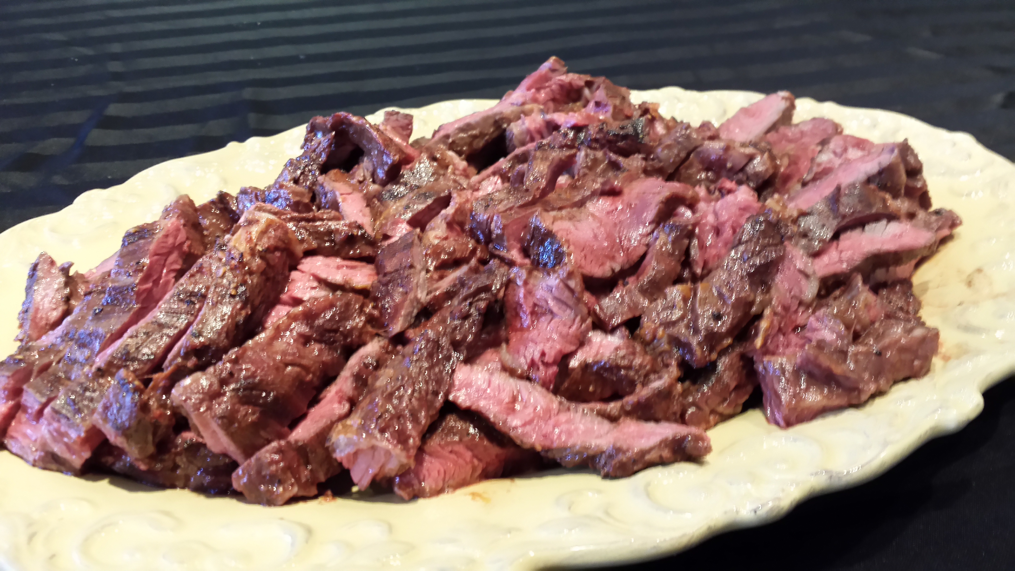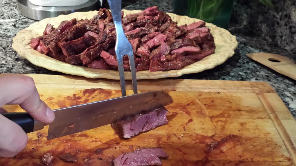 Now here’s the key part of the process – the slicing… First, cut your skirts WITH the grain into four or five inch chunks. Then, spin each piece 90 degrees and slice AGAINST the grain for plating and serving. This cross-grain cutting is absolutely key to eating this kind of steak. It makes for an easier-to-chew bite of meat; way more tender.