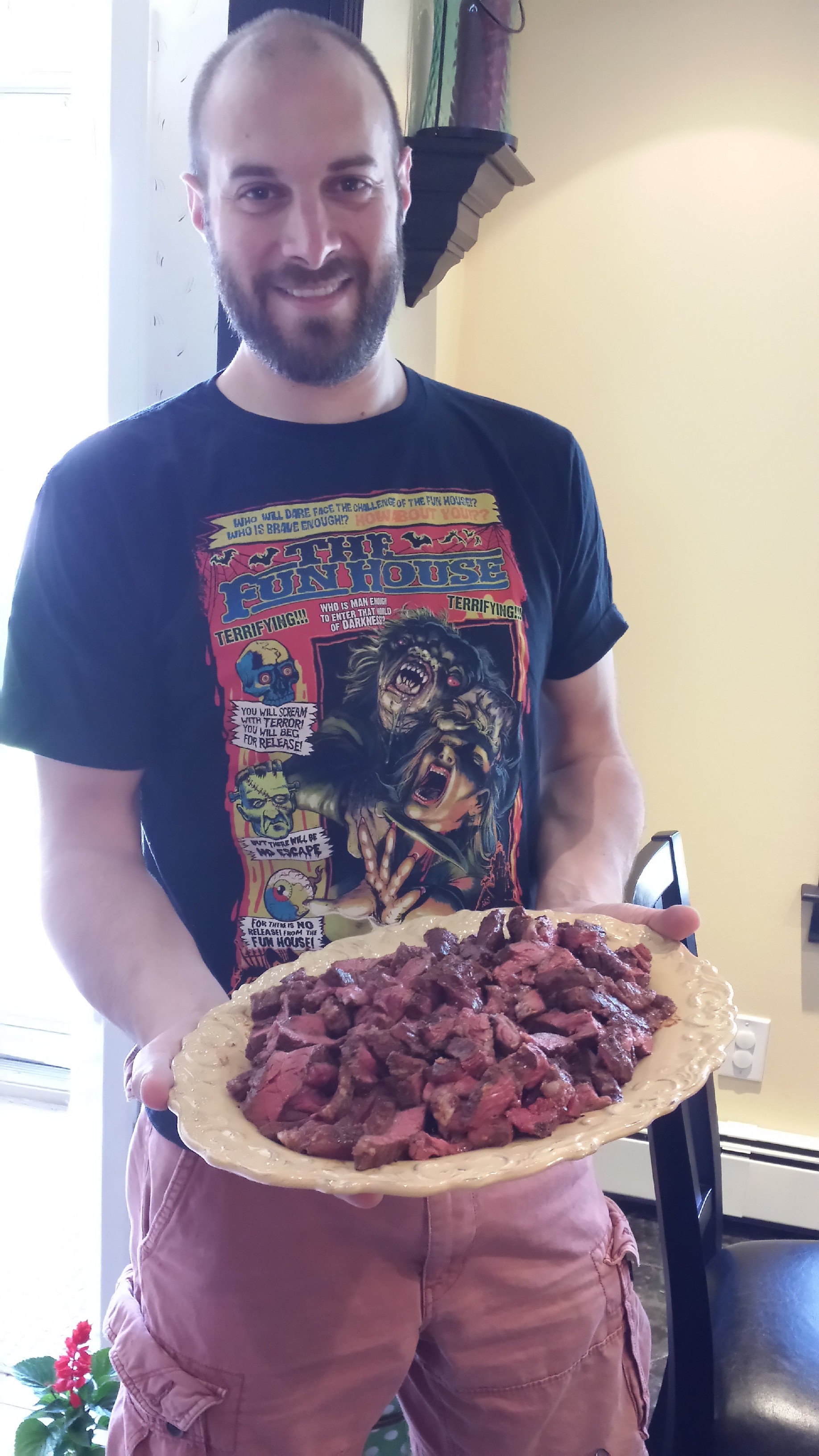 Grab a large, long piece tupperware and pour some tomato juice into the bottom to create a little layer of marinade. Season with crushed red pepper, cracked black pepper, salt, and garlic powder. Drop a few slices of your habanero pepper in too. Then place two of your steaks in, and repeat in layers until you run out of steaks. I like to use a whole pepper per layer, because I like spicy shit. Top off your tupperware with a little more juice and spices so every square milimeter of meat is covered with the marinade. Then throw that shit in the fridge for several hours, or overnight.