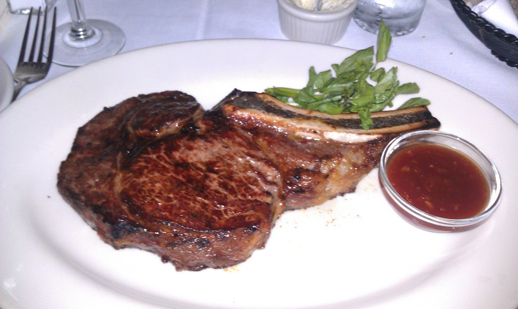 As usual, I had the ribeye (because I have a dick and balls between my legs, not a vadge). It was nice looking, bone-in, probably around 22oz., but it was a little overcooked from the medium that I ordered it. Also, it bled out a slight bit underneath the meat. It wasn’t too hot or anything, but I think it wasn’t dry or crusted enough on the outside to lock in all the liquids. I was going to give it an 8 here, but with so much stiff competition in the area, I had to go with a 7. I’d eat here again, don’t get me wrong, but perhaps if I was shopping for a spot in this particular area, I’d just wander a few feet over to Tad’s (just kidding… I mean Del Frisco’s). By the way the steak sauce that came in the little tub alongside the steak here was pretty good too – a little boozy actually. I like that.