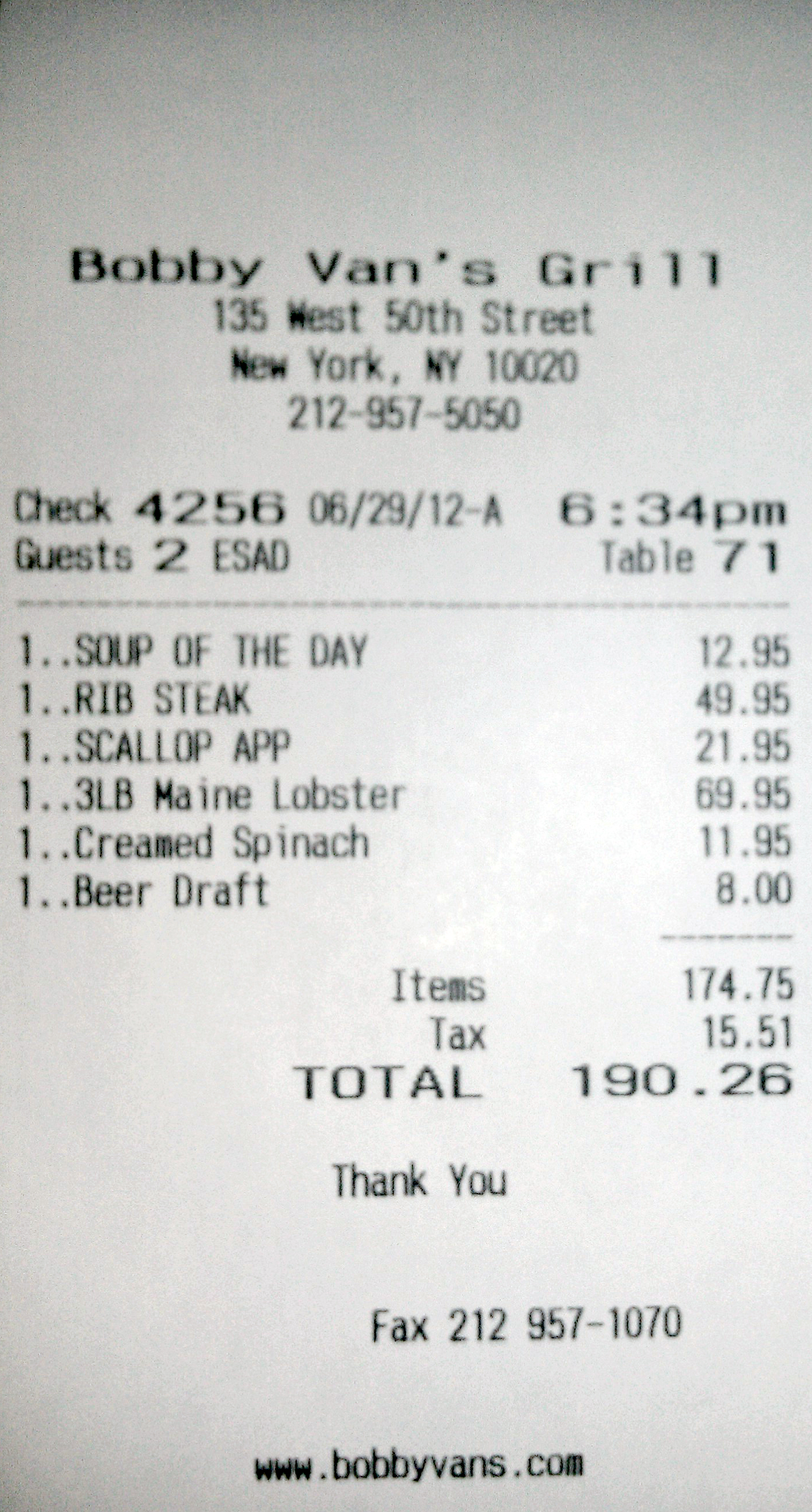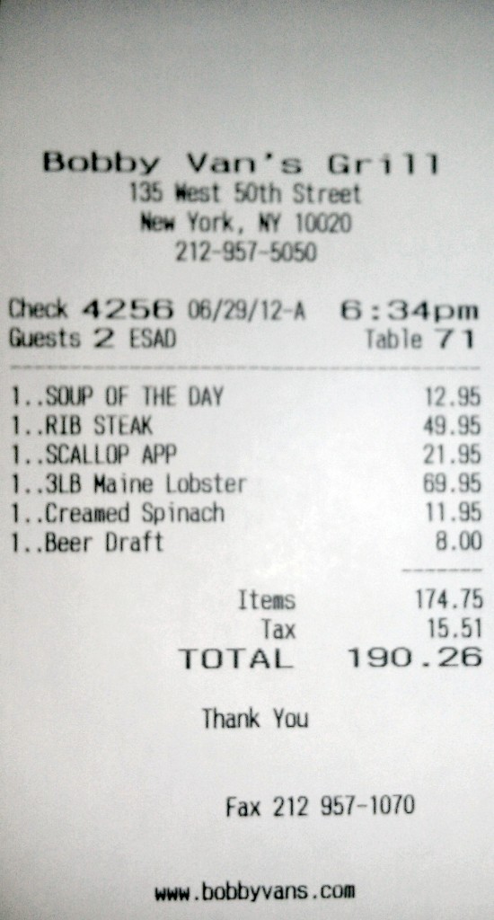 Tonight Johnny Prime gave the old “in-out, in-out” to Bobby Vans’ west 50th St. location. Not a bad meal overall, but not stellar by any means. I think I enjoyed the Bridgehampton location better, even though those douche bags didn’t offer a ribeye when I went. Check out the breakdown, assholes: