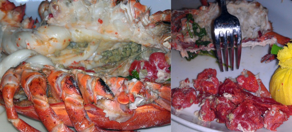 This would have been a 10, but they had NO OYSTERS and NO CLAMS. Other than that they did have lots to choose from. The specials were halibut and swordfish, and they were in addition to the standard menu items like lobster, seabass, tuna, crab cakes, and salmon. My wife had the lobster. It was a bit overcooked and chewy in parts, but it did have lots of the brains, guts and roe, which she likes. It was also chock full of meat, and the waiter pried most of it out of the shell for us tableside. OH – and the lobster came with a bowl of fresh corn as well. I can’t wait to see it polka-dotting my shit later.