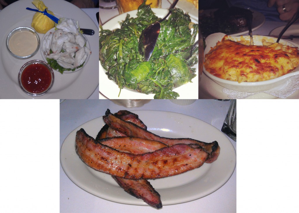 We started with the slab bacon and lump crab. The crab was great – big lumps of meat, juicy, cold, and a good portion size; probably 4oz. The bacon was tremendously portioned. Look at the amount of thick slices they give you below. It was tasty, but one or two slices were WAY too salty. On the side we had sauteed spinach and mac & cheese. They were both above average to good, especially the mac & cheese. It had a great crispy baked top. Also big portion sizes. For dessert we tried the brownie ala mode. The brownie was dry, and most definitely needed the ice cream on top to moisten it.
