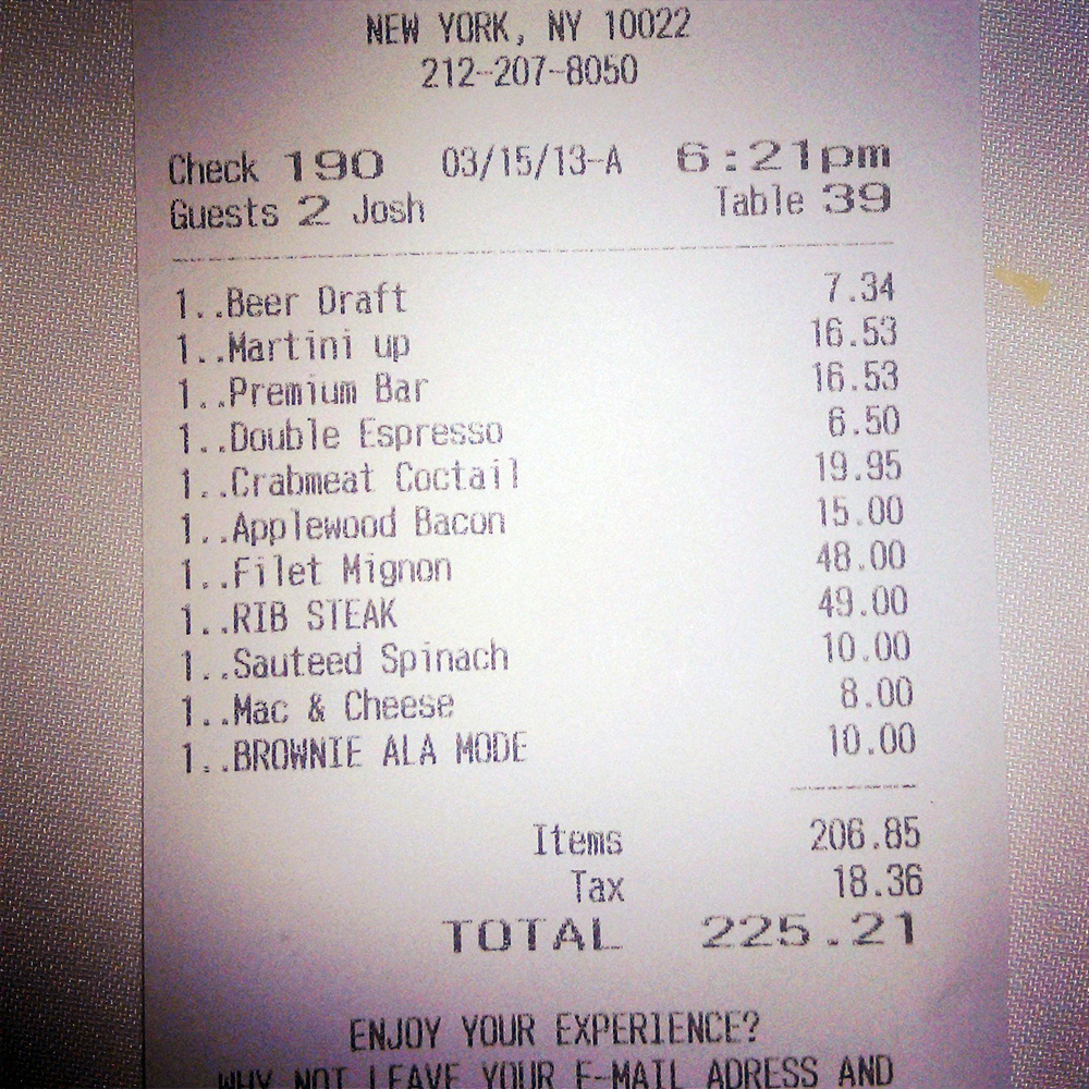 Prices are far too high for drinks here. I’ve mentioned before that Bobby Van’s is a little out of hand for drinks. Honestly – $16 for a Jameson on the rocks? Who the fuck are you kidding? With tax and tip, a martini will run me $18-$20. Fuck that. I’d rather drink my own semen. Other than the unbelievable drink prices, the other stuff wasn’t too bad, with the exception of maybe the dessert or the espresso. The plus side to it; the food was well worth the money, especially since we were able to use a Groupon deal for “$100 gets you $200 worth of food.” Sweet.