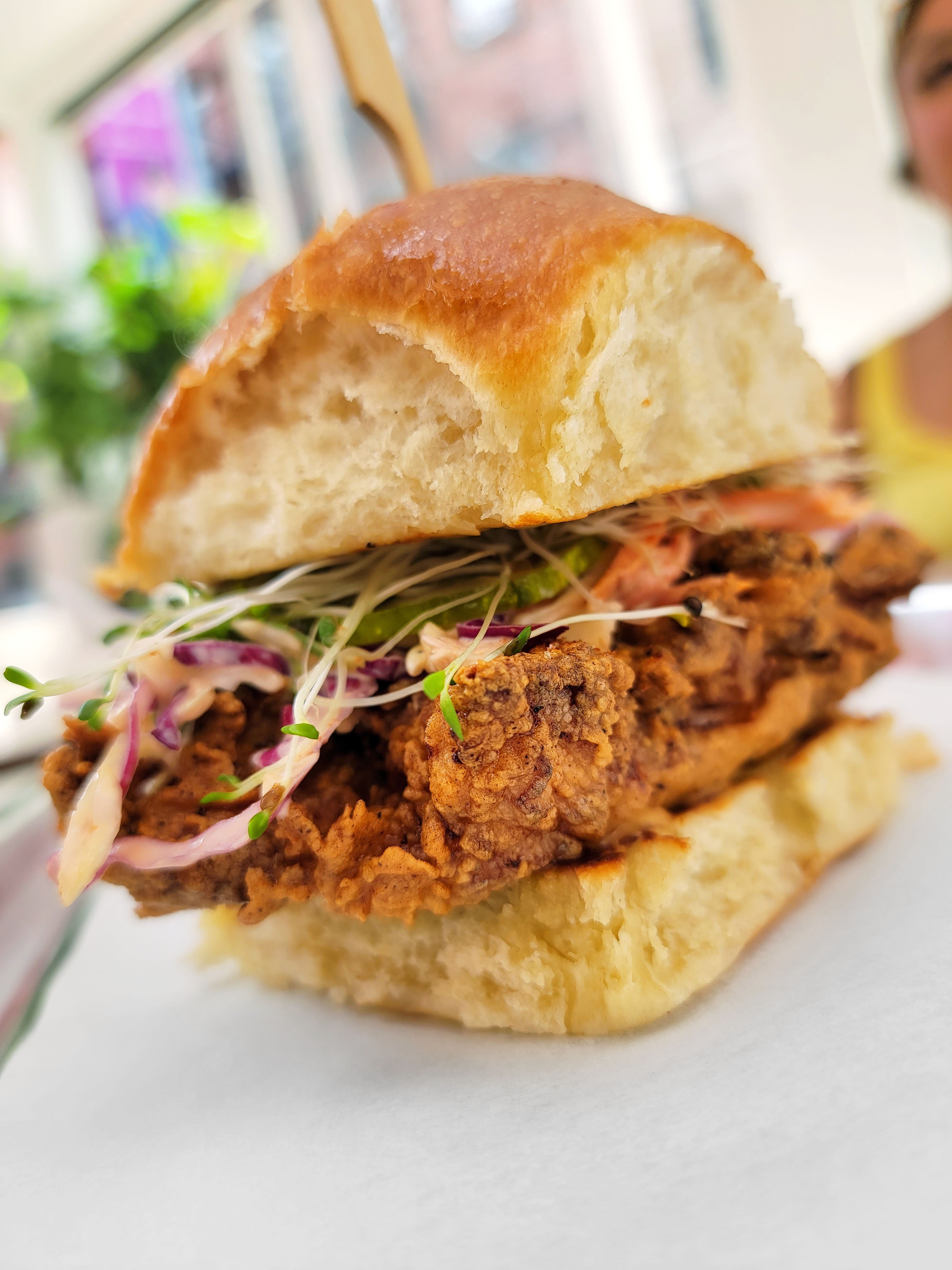 The chicken sandwiches are made from fried thighs, so they’re extra tender and juicy!