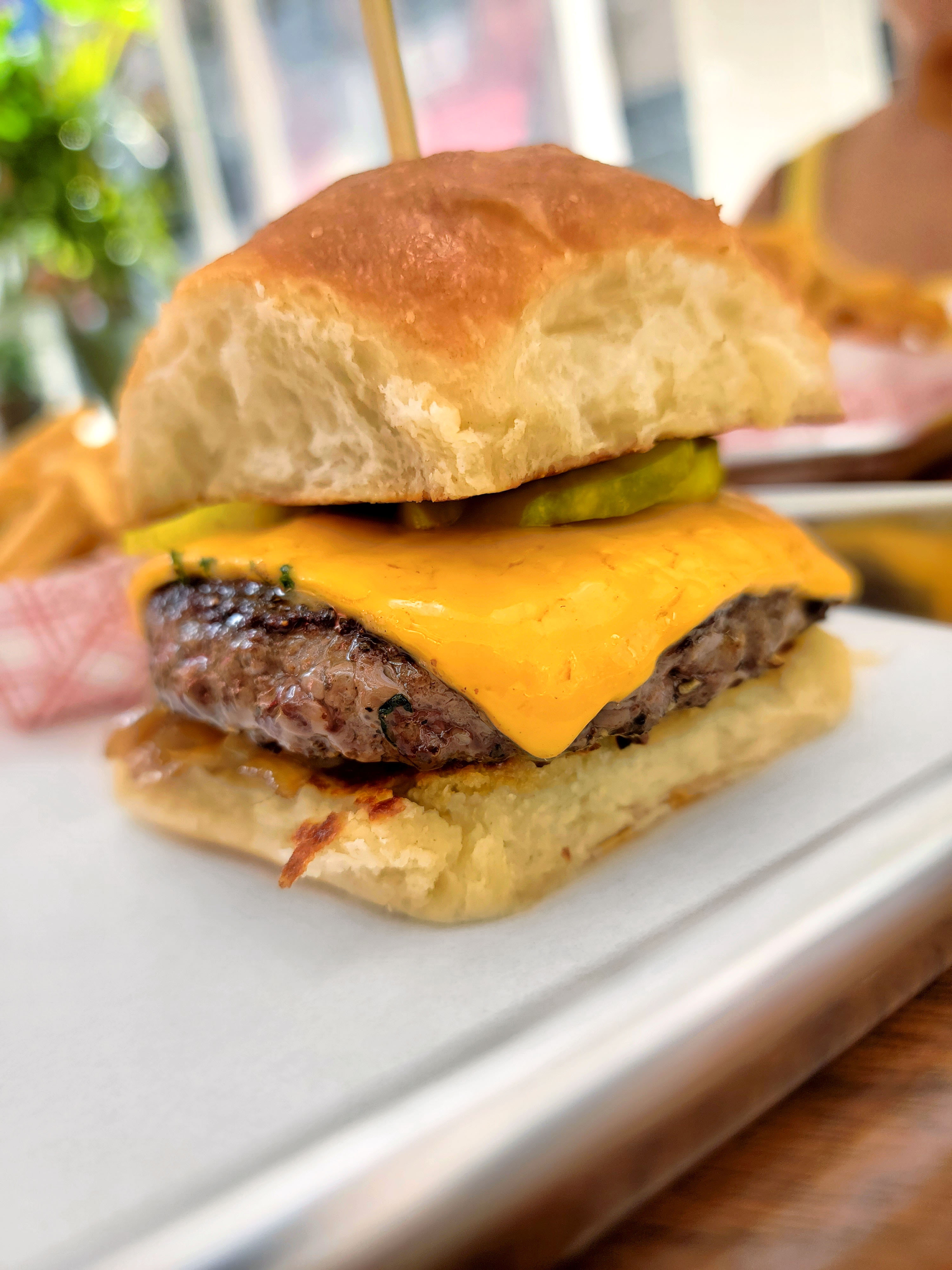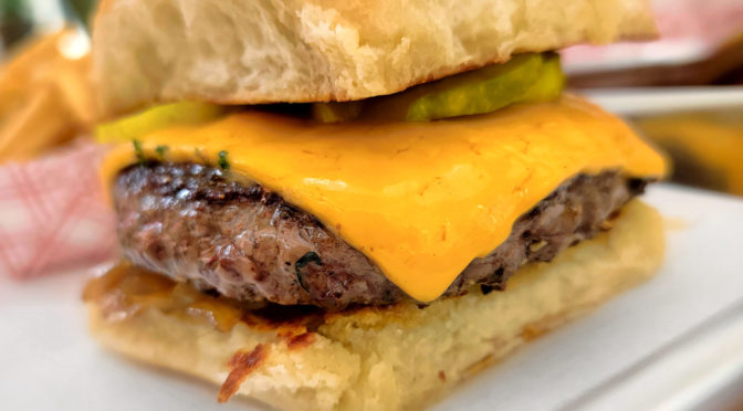 They’re serving Golden Packing beef burgers with cheddar, pickles and caramelized onions on a delicious house baked bun.