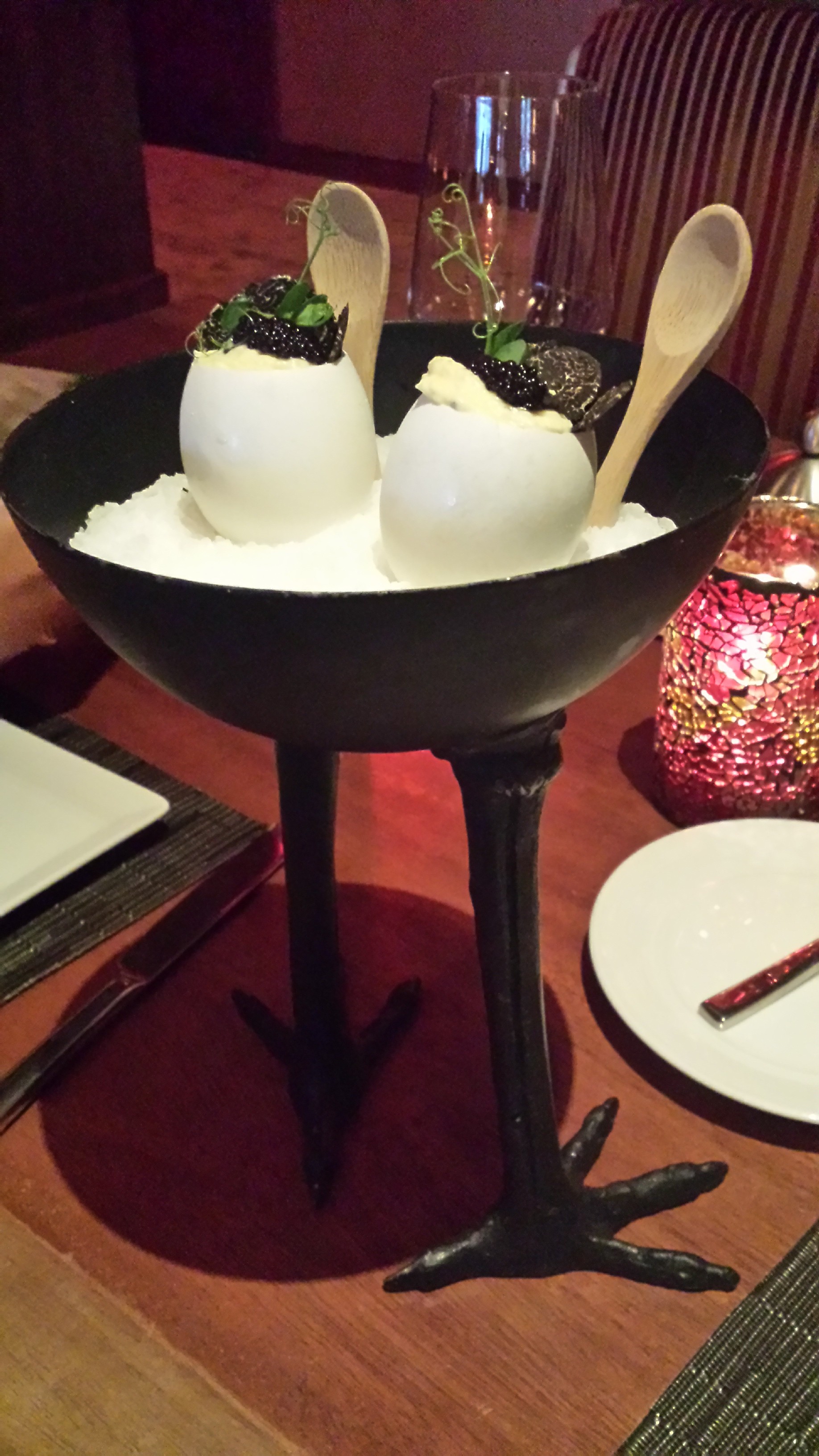 Then, before we knew it, this really cool stand of deviled eggs with caviar and winter truffle came out. It was delicious. Creamy, earthy – a perfect way to start the meal.