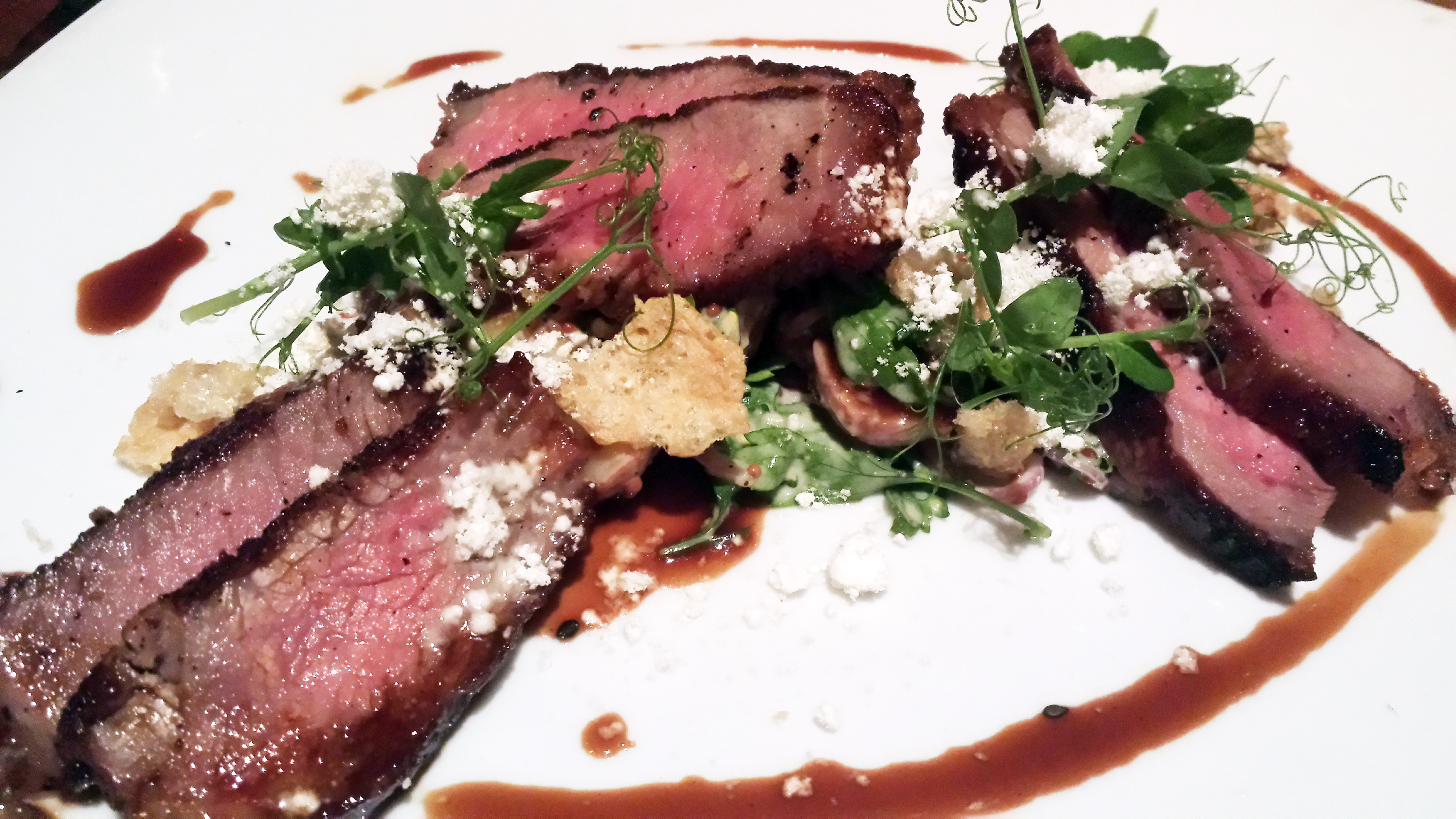 Oh yeah baby – here it comes. Aged New York strip with tangy mustard potato salad and bone marrow powder, drizzled with a bone marrow bordelaise. Let’s just say that the meat man went home a very happy dude. Perfectly cooked to medium rare, sliced and plated beautifully, TONS of flavor and juiciness.