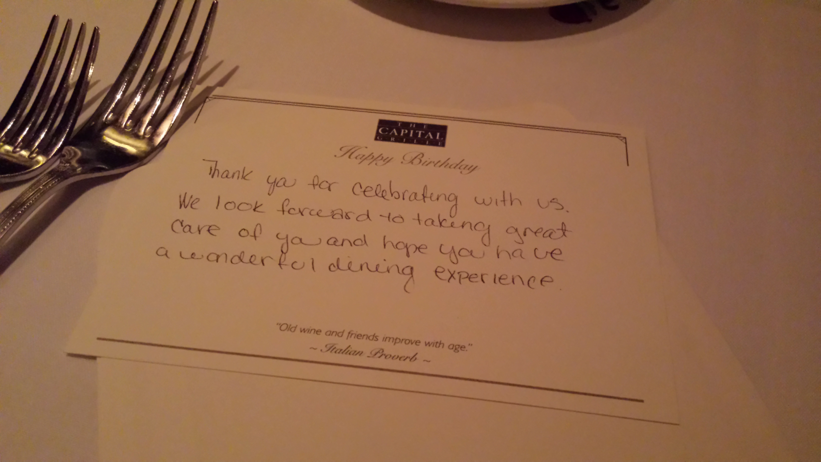Not only was the burger great, but so was our waiter, Jeremy. I felt like I’d known him for years! After my buddy graciously picked up the tab for the three of us and bolted to catch his train, me and my other buddy got to chatting with Jeremy about various different steak and burger places around town. Let’s just say I now have a bunch of new places on my short-list, both for burgers AND steaks. Thanks Jeremy: I truly appreciate the heads-up on those places, and I’m looking forward to dining at Capital Grill again, hopefully with you as the waiter.