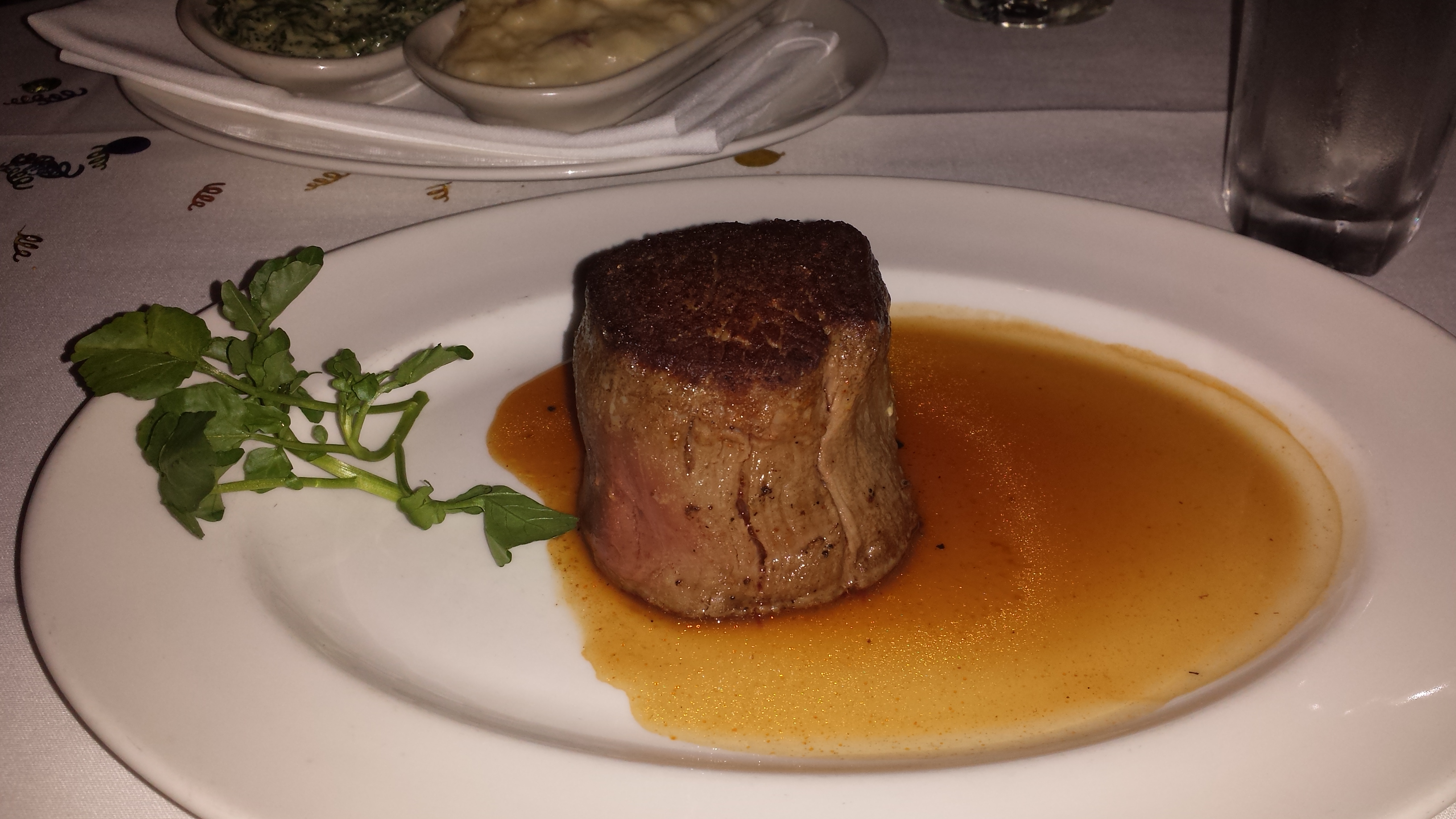 Unfortunately, my Delmonico steak came rare despite ordering it medium. The replacement steak was not rested, and when I cut into it, it bled out all over my plate, leaving me with a pool of juice and a feverish struggle to finish before it got dry. The steak also had a bit of inedible fat on it, but it also did have some nice melty yummy fat too. It tasted good, but I had to add salt and pepper because they rushed my replacement and didn’t season it properly. I tasted the filet as well, since my coworker ordered the price fix for ladies (FYI he is not a she), which came with an 8oz filet (no bigger than a good burger). It was perfectly cooked and juicy. So rather than the minus 5 that this place would have gotten for the incredible steak mishap, I added a point back for the filet. Keep in mind that mishap threw off the entire flow of the meal. My coworker had to start eating otherwise his steak would have gotten cold, and I was sitting there poking at the sides while waiting for my unrested, unseasoned $45 steak. Sons of bitches… On a second visit I went for the $39 price fix theater menu’s Kona crusted sirloin, which comes in at 14oz. Not a bad steak for the deal, but I think the 8oz filet tasted better (my buddy got that). Either way the points went up here after the second visit. See pics below (FYI that is shallot butter that they dumped on the meat):