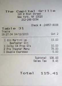 Martinis were $11 (good); my Delmonico steak was $45 (semi-okay if not for the complete fuck-up of my order); the pussy-ass price fix dinner was a great deal at $39 (Caesar or mixed greens salad, filet or 14oz sirloin, 2 sides and dessert). Otherwise sides were $10; and apps were anywhere from $12 to $17. The total bill for two, including three drinks, was $165 with tax and tip included – not bad. Here is the very reasonable bill from my second visit, when we had the theater menu price fix: