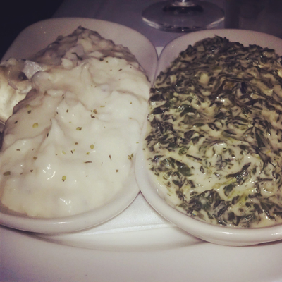 They have a fair selection here. They offer a filet and a filet oscar for the (!)s of the group (A (!) is a pussy – look at it closely). They have two preparations of sirloin (cognac peppercorn being one, and the other just being regular grilled/broiled), a porterhouse, and a ribeye. The essentials are covered with a little variation, but not enough to live up to other joints in the neighborhood. The ribeye was semi-bone-in. I say that not because it was a half-limp penis, but because there were two very small pieces of bone that were part of the cut. I was a little disappointed, like a woman if she tried to get it on with a guy that had a half flaccid penis instead of a rock-solid longbone.