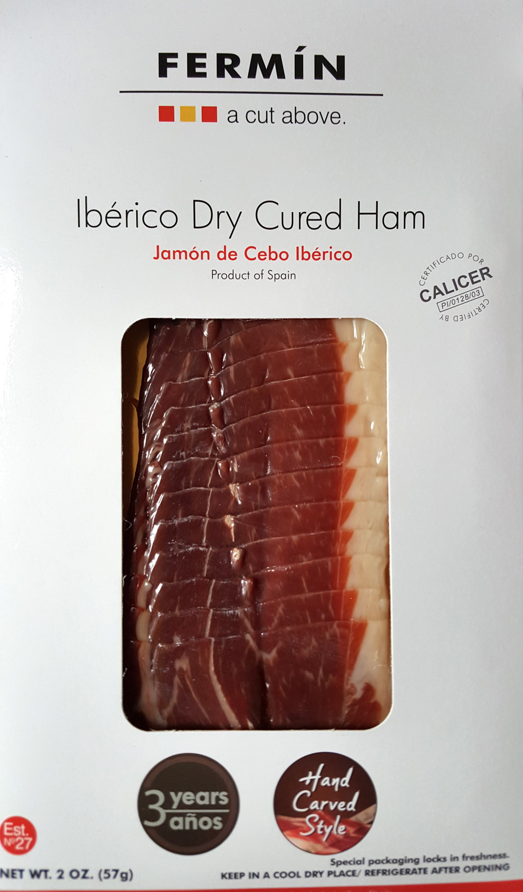 The top left is the chorizo that I sliced, so we will skip that, since I already talked about it. The top right was another type of chorizo. This one was softer, a little more moist, had less fat content and a more smoky flavor. Clearly they had different diameters too. I really thought I was going to get jipped here with two of the same type of meat, as far as flavor goes, but the two chorizos were very different from one another. The bottom right was the salchichon. Like the chorizo, this had good melty fat content, but it was a more mild and more pure flavor. You could taste the meat, unencumbered, because it wasn’t laden with spices. Very crisp. The sparse peppercorns really made it pop too. The bottom left was the dry cured ham. This was really soft. It had the texture of a very high quality prosciutto, with a clean flavor. Really nice meat, excellent non-stringy fat. It wasn’t paper thin, but the flesh was so soft to the touch that it was difficult to get each slice up in one piece. That’s freaking tender shit!