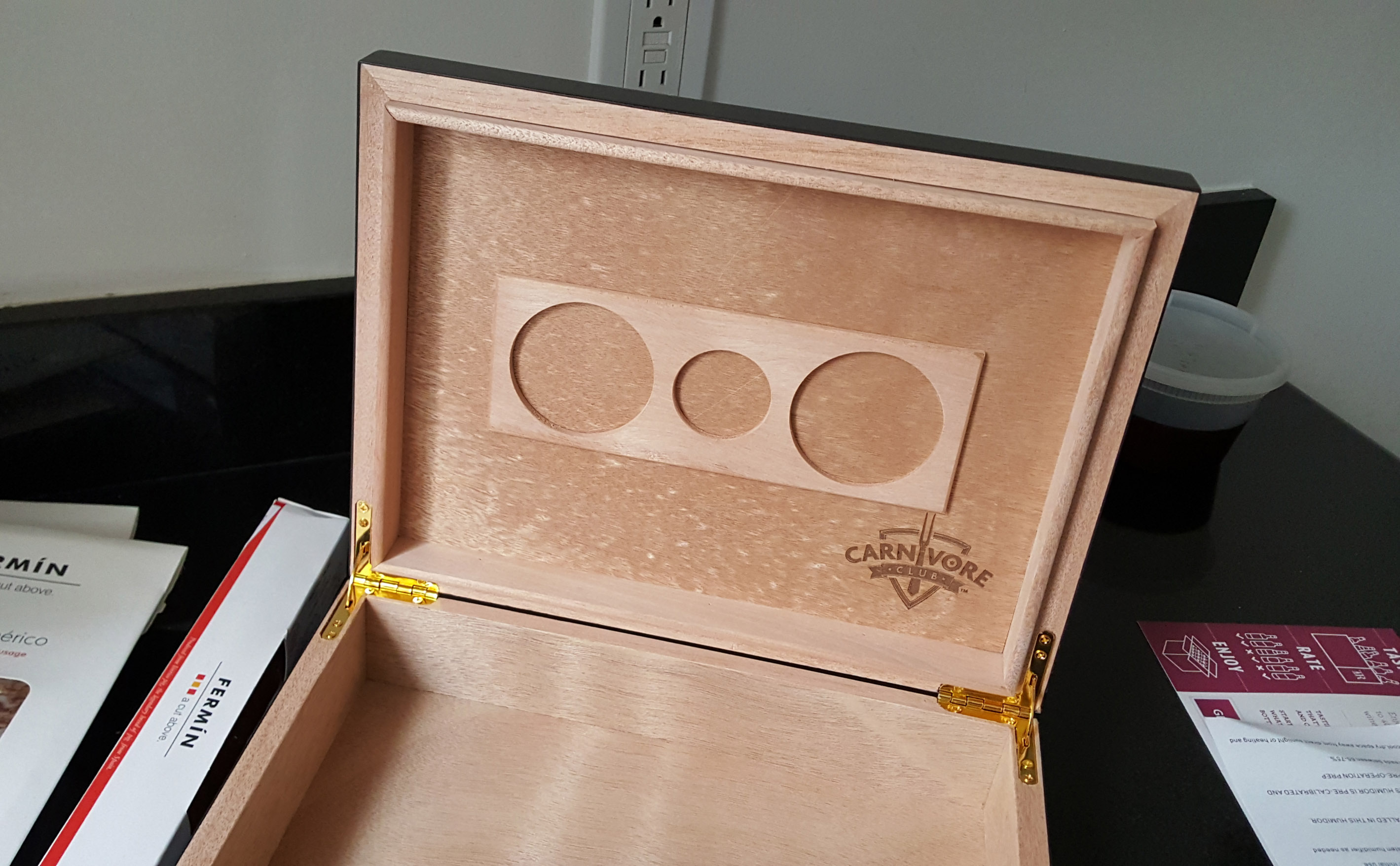 Again, mine was a premium box (which is generally much more costly), made of real wood, nice hidden hinges, ultra high quality meats, etc. The regular packaging is a faux wooden box, still very smart looking. But take a look. Mine even came with the humidity gauge and shit.