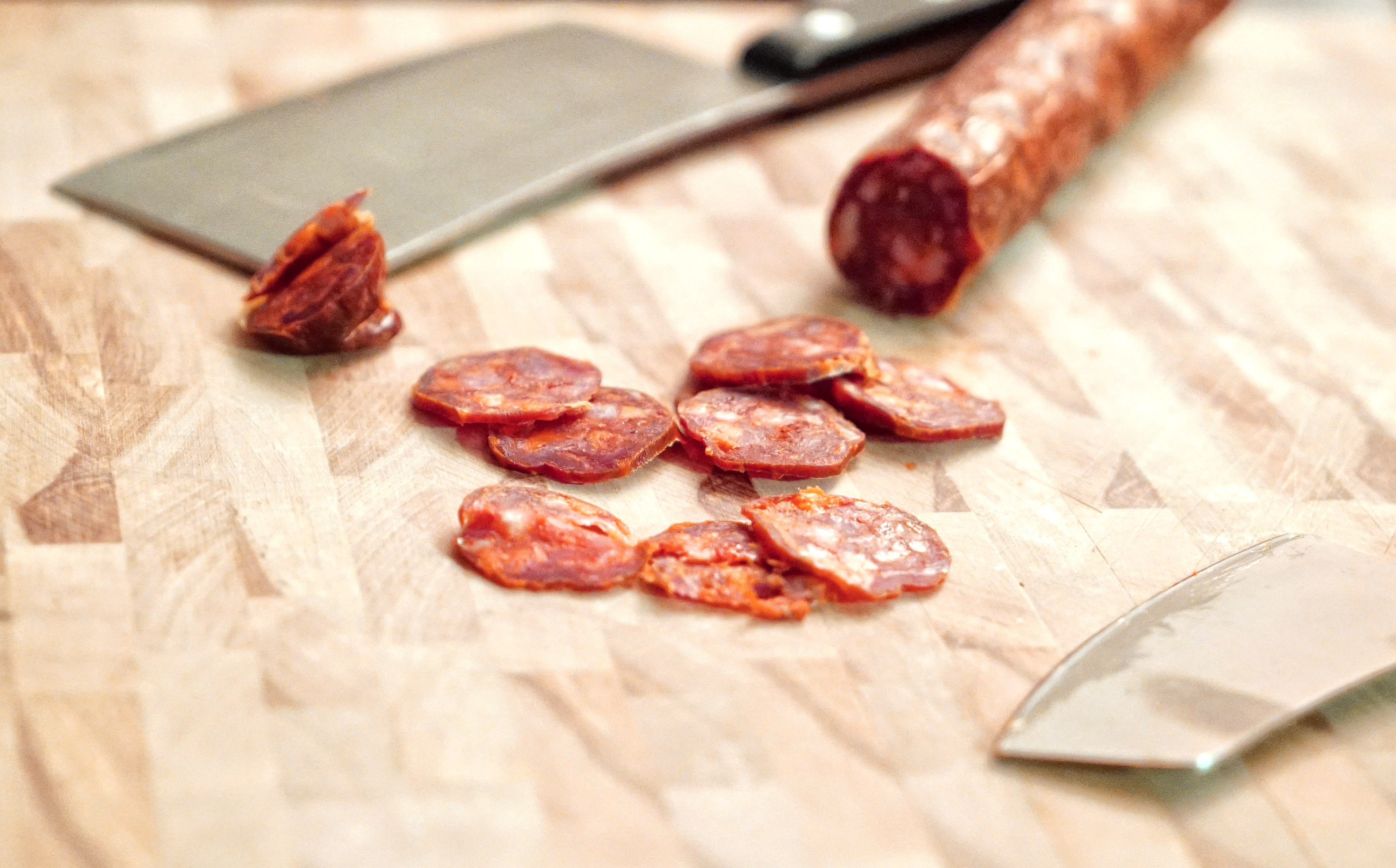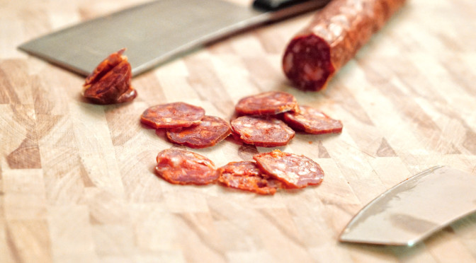 The first thing I did was to slice up some of the chorizo, which you saw in the video above.