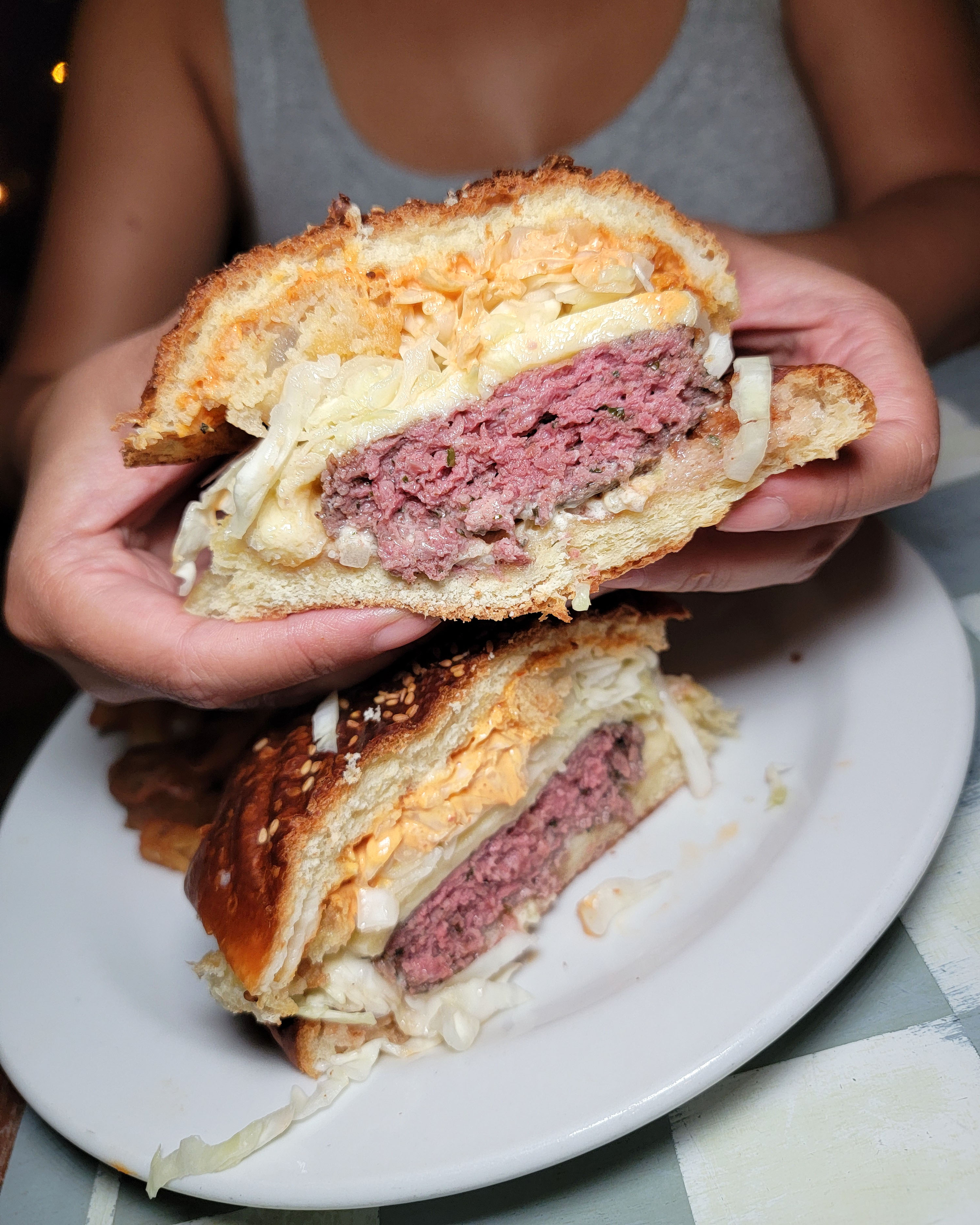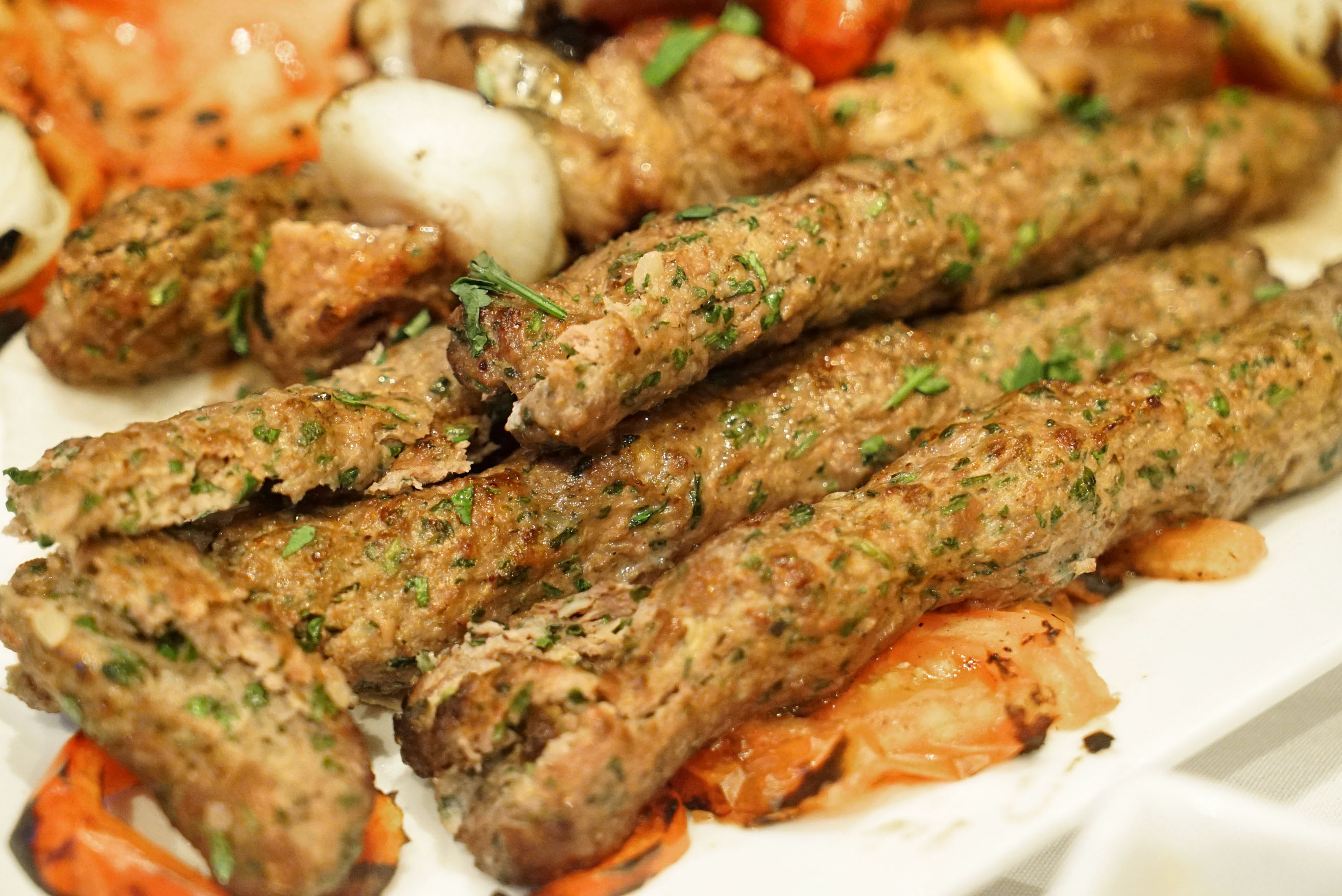 The mixed grill usually comes with three types of meat: lamb shish kebab, chicken shish taouk, and beef kafta kebab. We limited the selection to just the beef and lamb, however, so as not to waste any food (we were already pretty full going into this course). The kafta was really the star here. The minced beef was seasoned aggressively with spices like parsley and cumin, and it stayed juicy from the onion. The meat was super tender, too, and had a nice charred/grilled flavor on the outside.